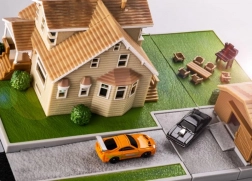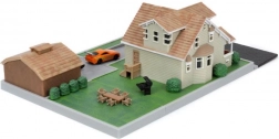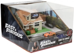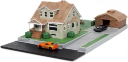 Detailgetreue Darstellung des Toretto House mit Haus, Garage, Auffahrt und Garten auf einem Sockel – ideal zum Ausstellen.