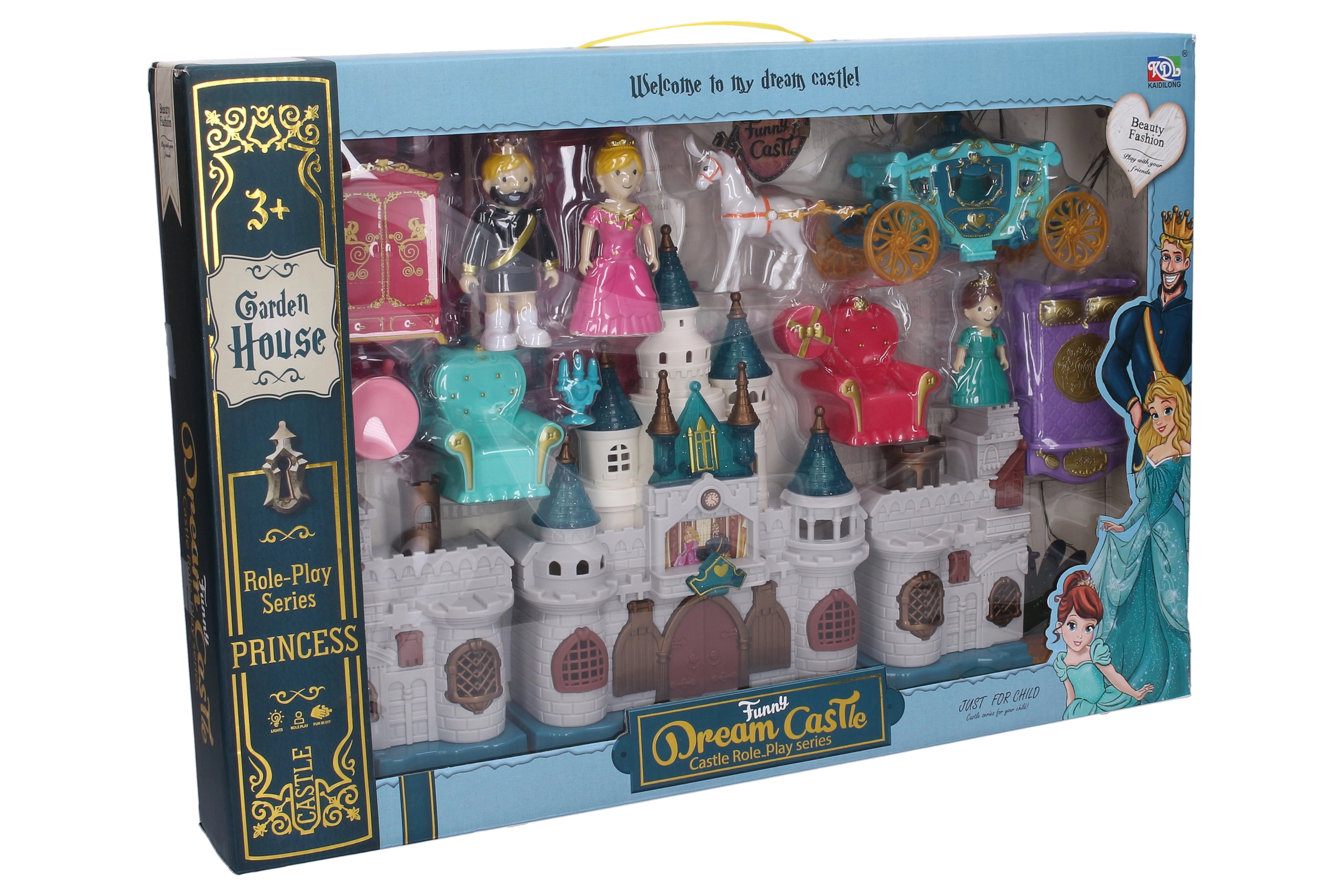 Zum Set gehören 3 Figuren, eine stilvolle Kutsche mit Pferd und ergänzende Möbel, mit denen sich unzählige Geschichten erschaffen lassen. Das Schloss ist aufklappbar, leicht zu transportieren und sofort einsatzbereit – die Batterien sind bereits im Lieferumfang enthalten.