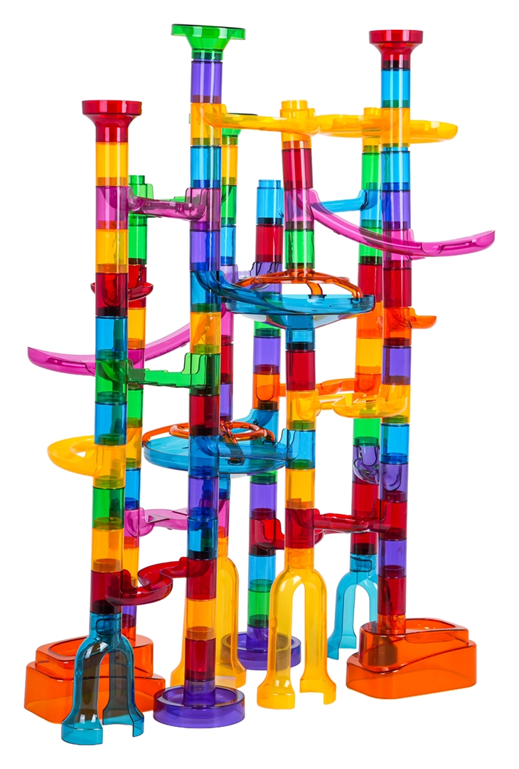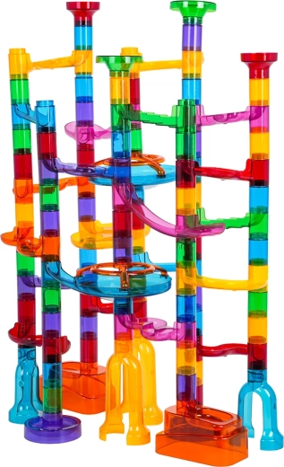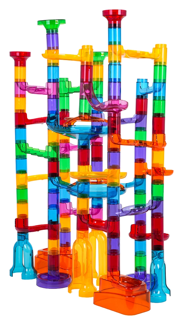 Robuste, transparente Komponenten in leuchtenden Farben sorgen für Stabilität der gesamten Bahn und für tolle optische Effekte beim Rollen der Murmeln.