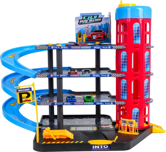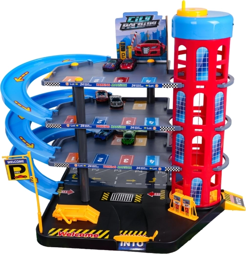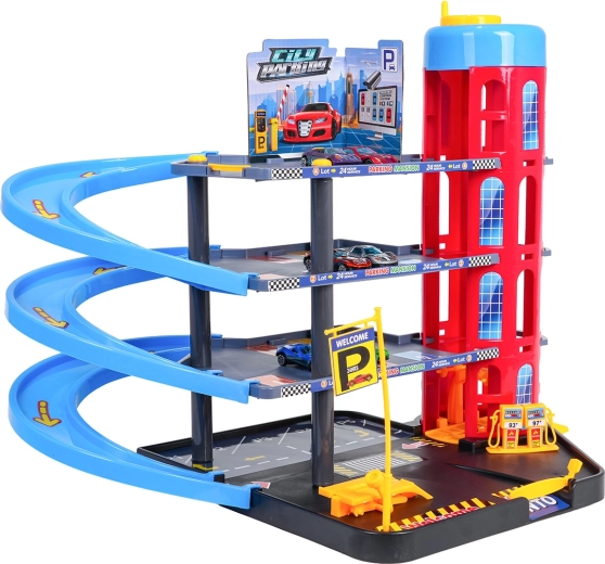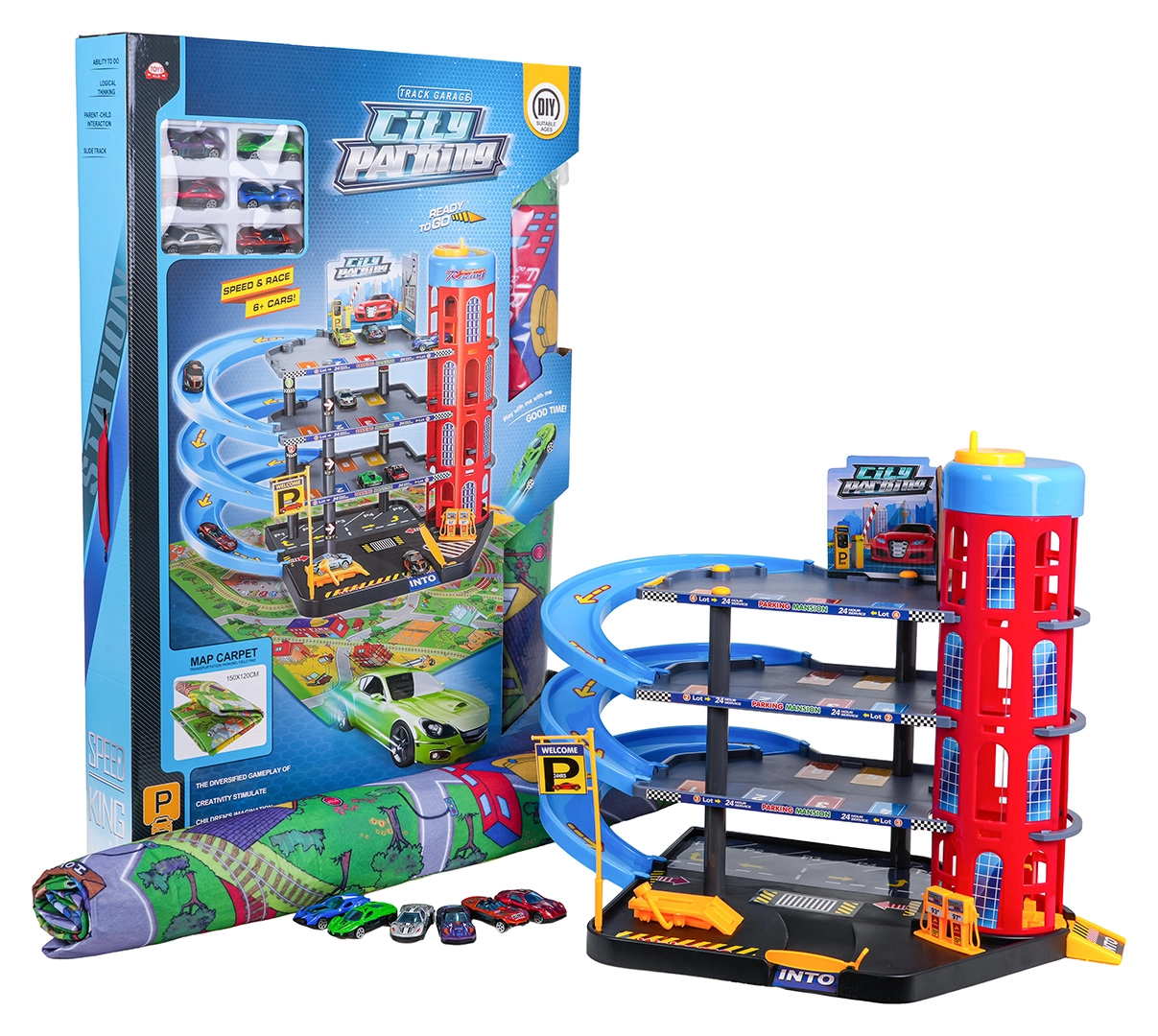Dieses farbenfrohe mehrstöckige Parkhaus kombiniert realistische Stadtelemente mit dynamischem Fahrspaß. Kinder können die Autos mit dem manuell bedienten Aufzug nach oben befördern, auf den einzelnen Etagen parken und über die spiralförmigen Rampen hinunterfahren lassen. Die integrierte Tankstelle, Service-Hebebühne und die Schrankenauffahrt unterstützen fantasievolles Spielen.