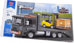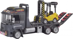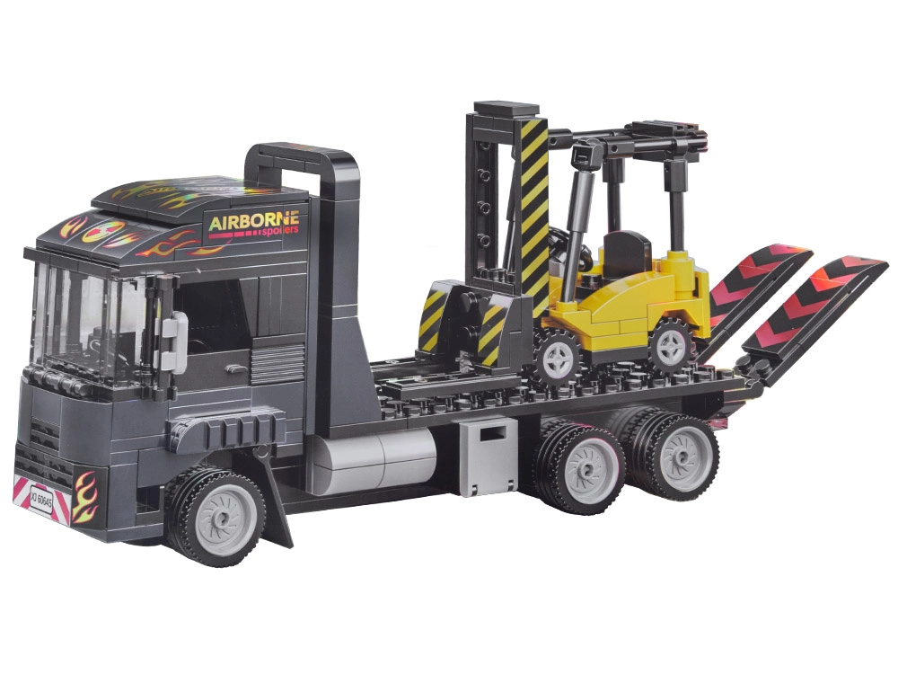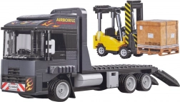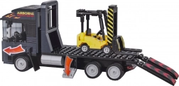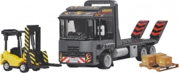 Der Sattelzug mit Plattform und klappbaren Rampen ermöglicht das Aufladen und den Transport des Gabelstaplers – genau wie in der Realität.