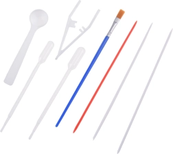 Wanne, Papiere, Farben, Pipetten, Kamm, Pinsel und Spachtel – kurzum alles, was Sie für Ihr erstes marmoriertes Bild benötigen.