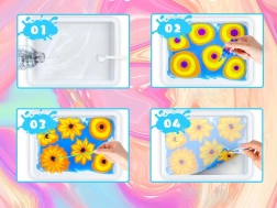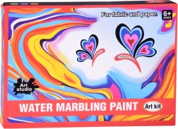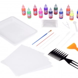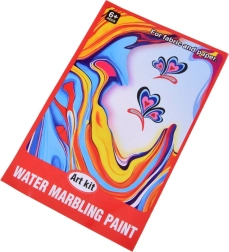 Im Set ist alles enthalten: 12 Farbfläschchen (16 ml) mit präziser Spitze, eine Kunststoffwanne, Papiere sowie ein Werkzeugsatz (Pipetten, Kamm, Pinsel, Spachtel u. a.). Nach dem Mischen des Pulvers mit Wasser entsteht ein gelartiges Bad, in das Sie die Farben tropfen und das Muster formen – dieses wird anschließend einfach auf Papier abgedruckt.