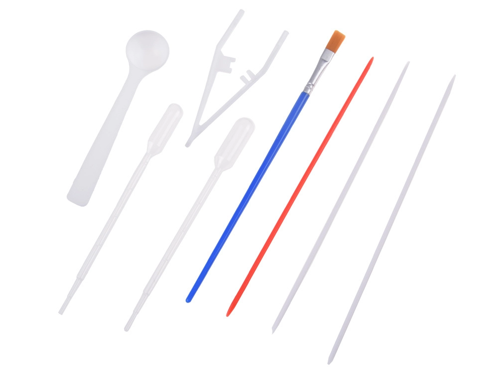 2 Pipetten/Tropfer, Löffel, Pinzette, Kamm, Pinsel, Spachtel, Zeichen-Nadeln