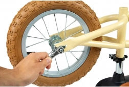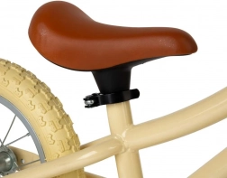 Der bequeme braune Sattel mit Schnellspanner ermöglicht eine einfache Höhenverstellung. Weiche Griffe sorgen für sicheren Halt für kleine Hände.
