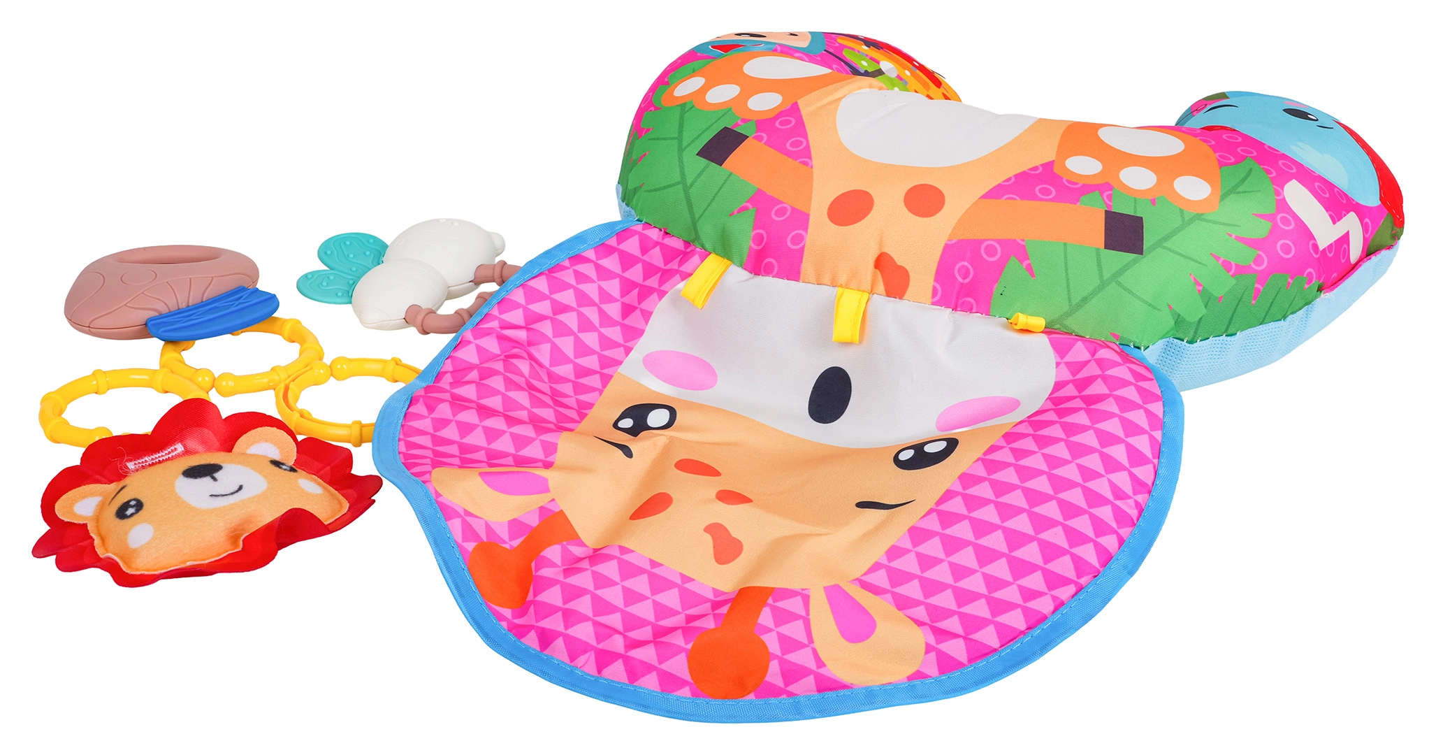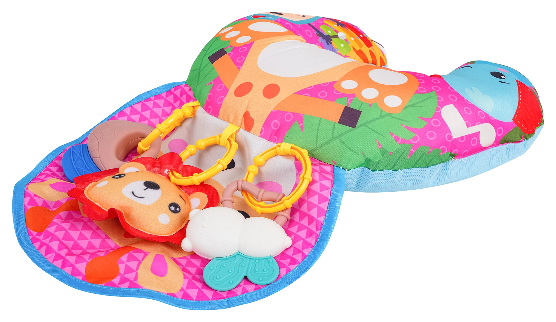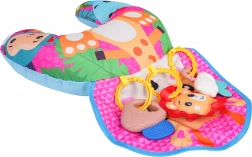 Im Set sind drei abnehmbare Hängespielzeuge enthalten – ein Löwe mit Quietscher, eine Biene mit Beißring und ein Schwämmchen mit Rassel. Fröhliche Farben und verschiedene Texturen regen Sehen, Hören und Tastsinn an und motivieren das Kind zum Greifen und Entdecken.