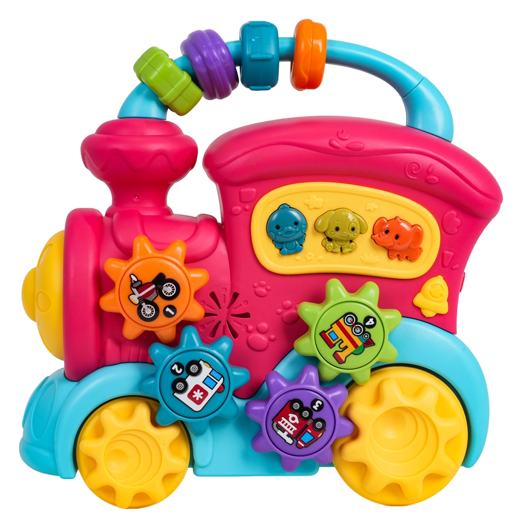 Der beleuchtete Scheinwerfer, Tiergeräusche, Melodien sowie das sanfte Rasseln der Getriebe unterstützen die sensorische Entwicklung und machen das Spielen zu einem unterhaltsamen Erlebnis.