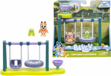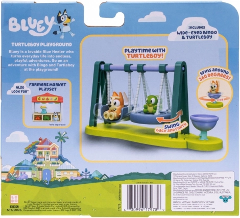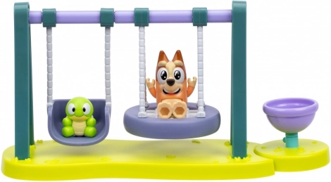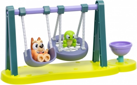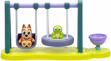 Dieses farbenfrohe Mini-Spielset mit Schaukeln begeistert alle kleinen Fans von BLUEY. Zwei funktionierende Schaukeln und eine Drehschüssel/ein Karussell laden zu endlosen Spielplatzgeschichten ein. Kinder können Bingo und das Schildkrötchen platzieren, vor- und zurückschaukeln und sie dann so lange drehen, bis sich vor Freude alles dreht.