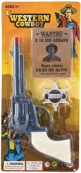 Verwandle das Kinderzimmer in den Wilden Westen. Der klackernde Plastikrevolver ist das perfekte Requisit für Sheriff- und Cowboyspiele und fördert dank des beiliegenden Sterns und „Wanted“-Posters Fantasie, Kreativität und soziales Spiel.