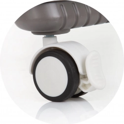 Vier Rollen für sanftes Bewegen im Haushalt und eine klappbare Konstruktion zur Platzersparnis bei der Aufbewahrung.