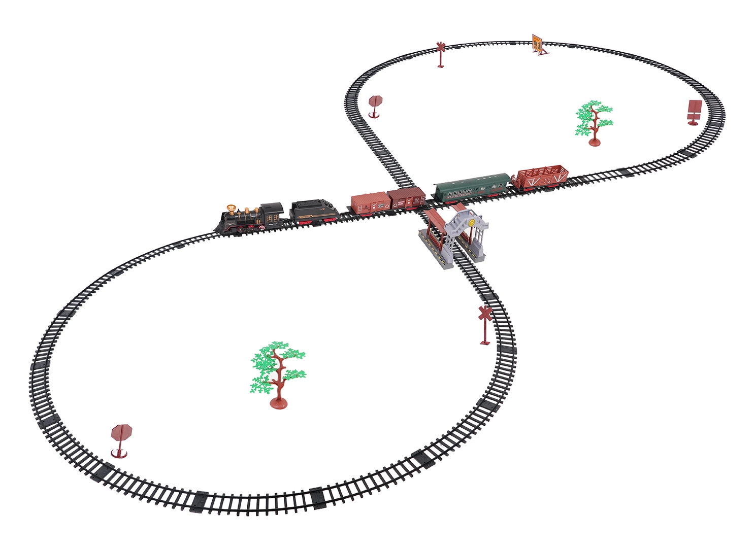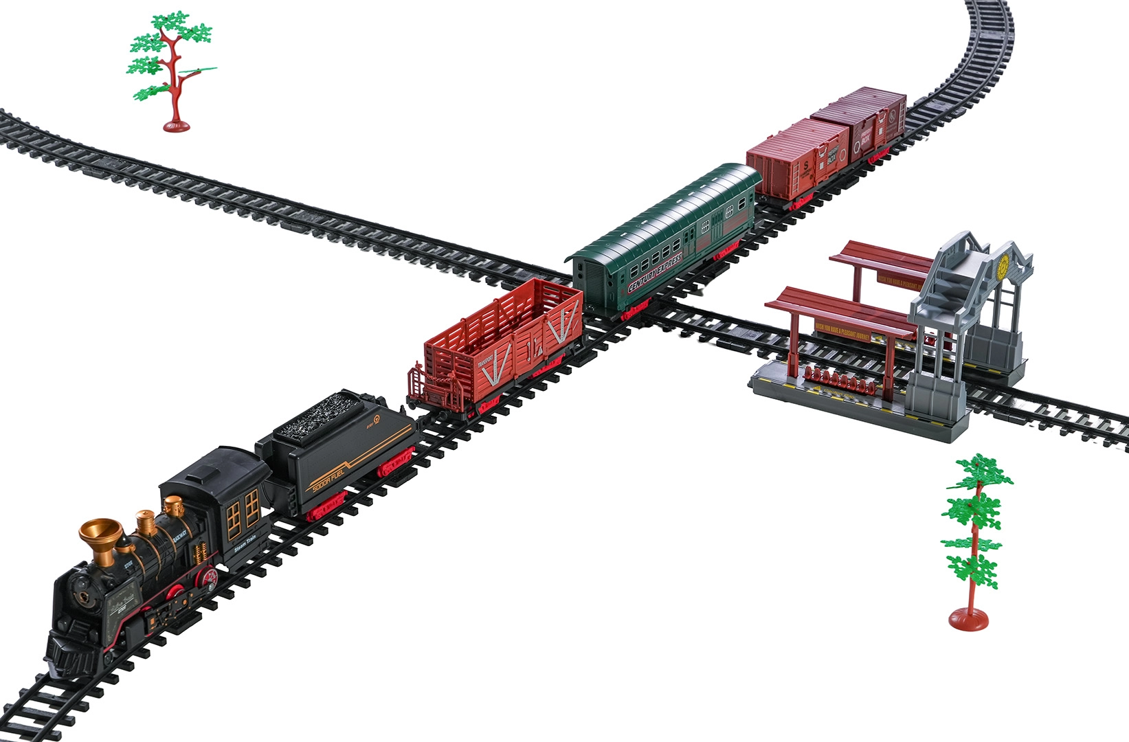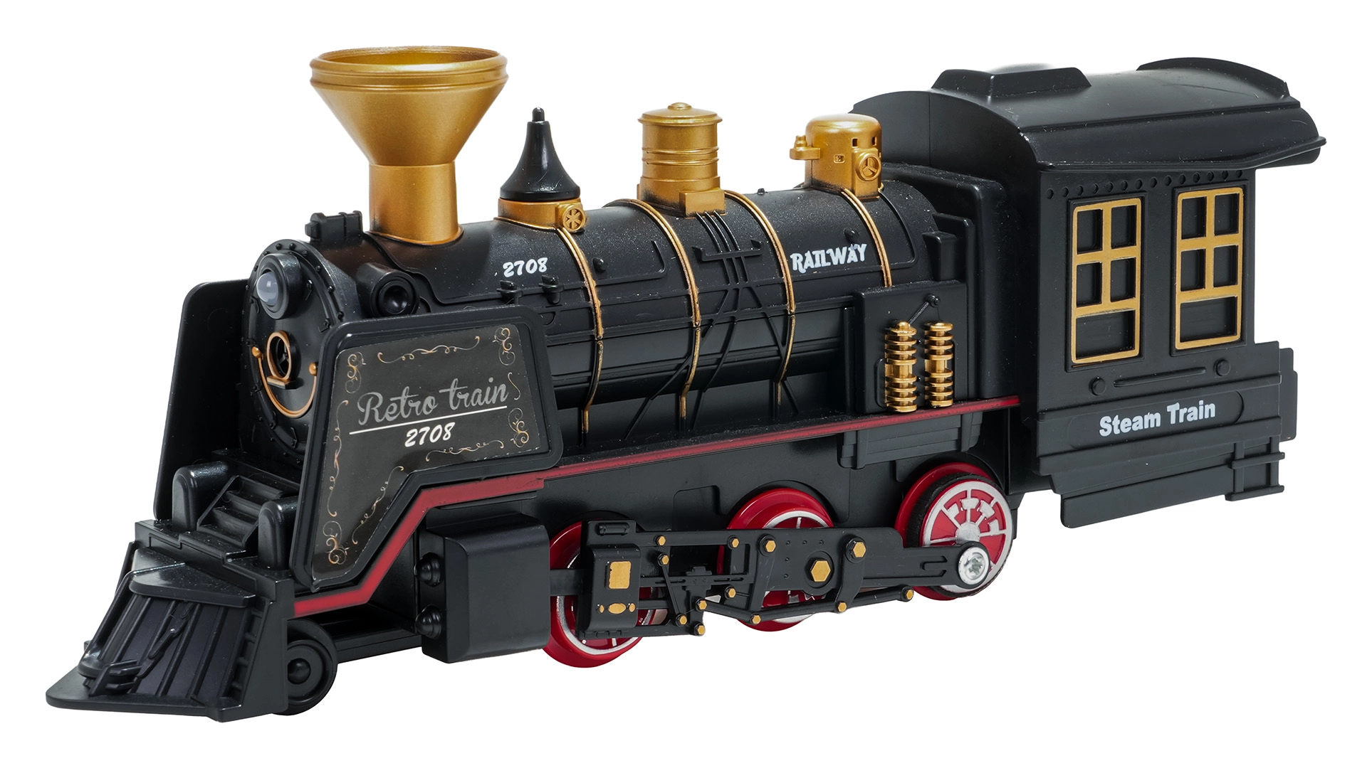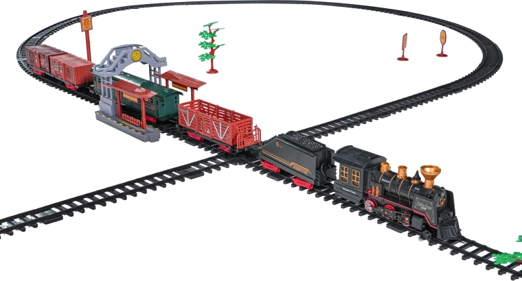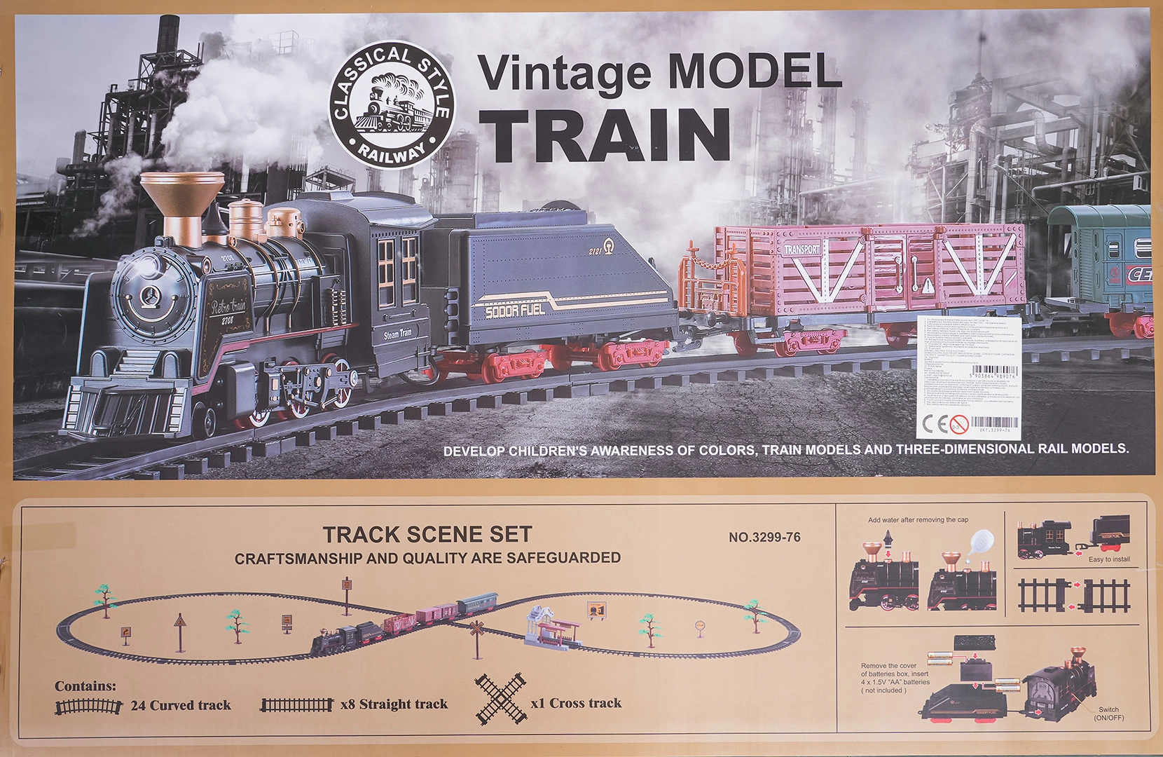 Dieser detailliert gestaltete Zug im Vintage-Stil bietet Kindern ein authentisches Fahrerlebnis. Nach dem Befüllen mit Wasser mittels der beiliegenden Pipette raucht der Schornstein der Lokomotive sanft während der Fahrt, das Frontlicht leuchtet und realistische Soundeffekte ertönen. Dank der robusten, sicheren und modularen Schienen bauen Kinder die Strecke im Handumdrehen auf und schicken den Zug auf die Reise.