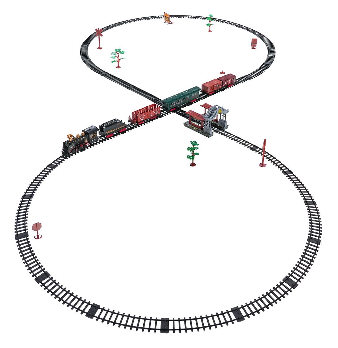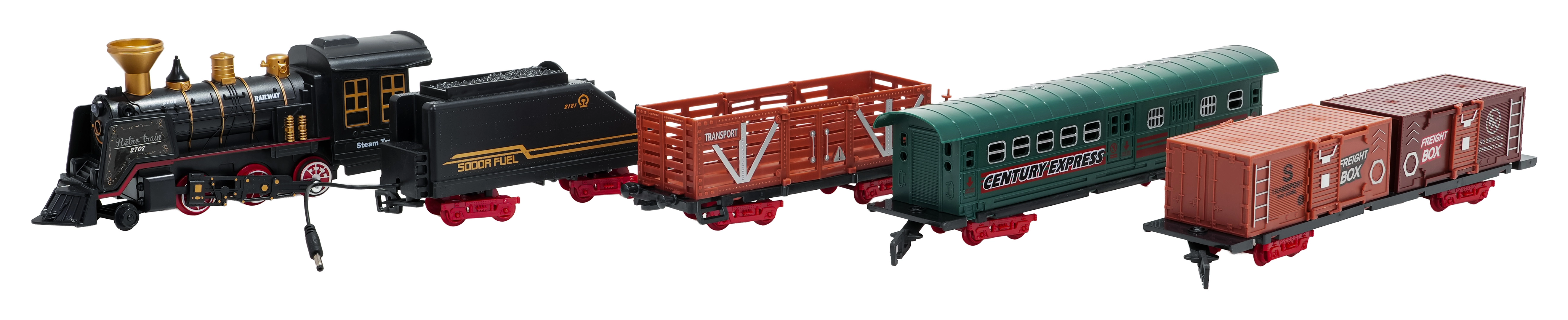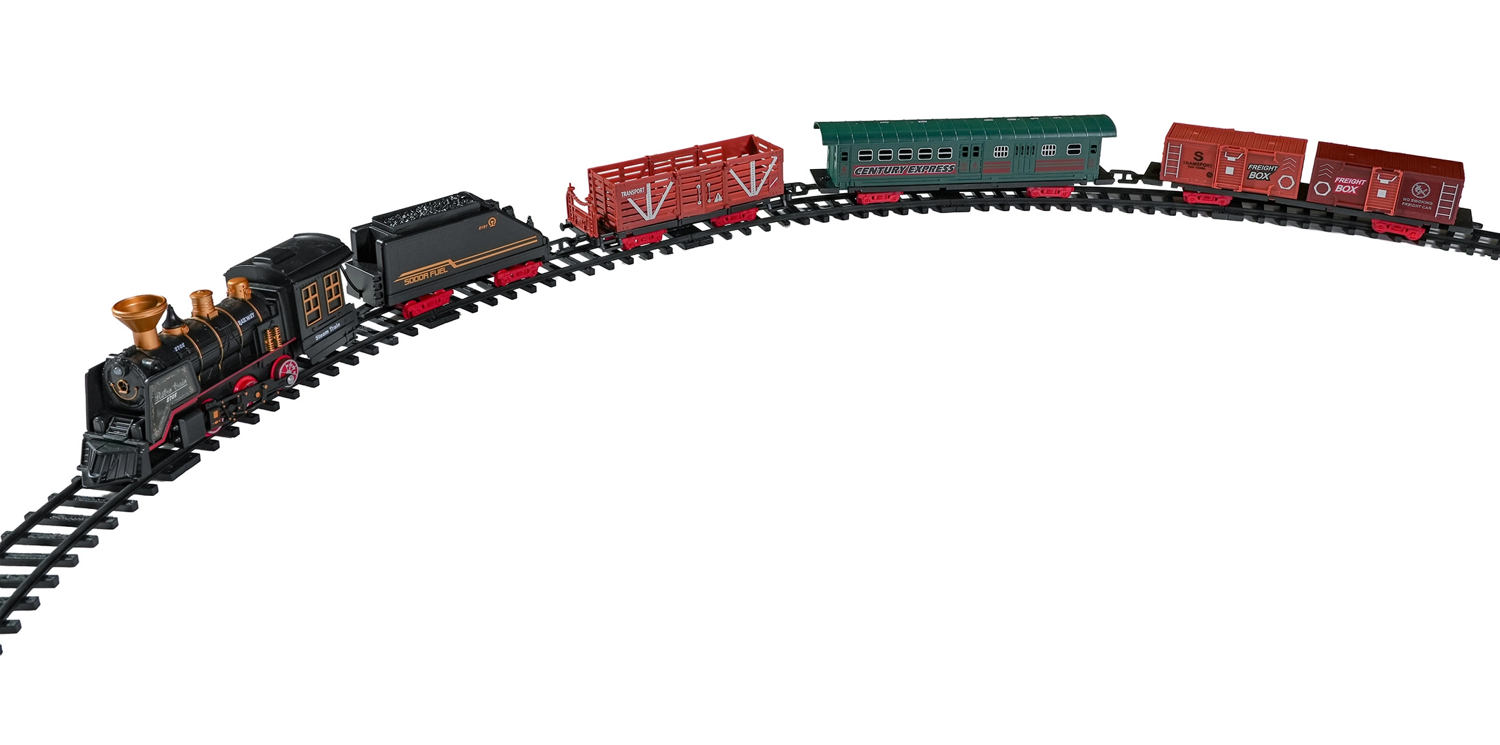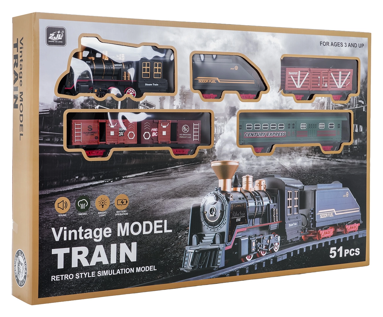 Dieser detailliert gestaltete Zug im Vintage-Stil bietet Kindern ein authentisches Fahrerlebnis. Nach dem Befüllen mit Wasser mittels der beiliegenden Pipette raucht der Schornstein der Lokomotive sanft während der Fahrt, das Frontlicht leuchtet und realistische Soundeffekte ertönen. Dank der robusten, sicheren und modularen Schienen bauen Kinder die Strecke im Handumdrehen auf und schicken den Zug auf die Reise.