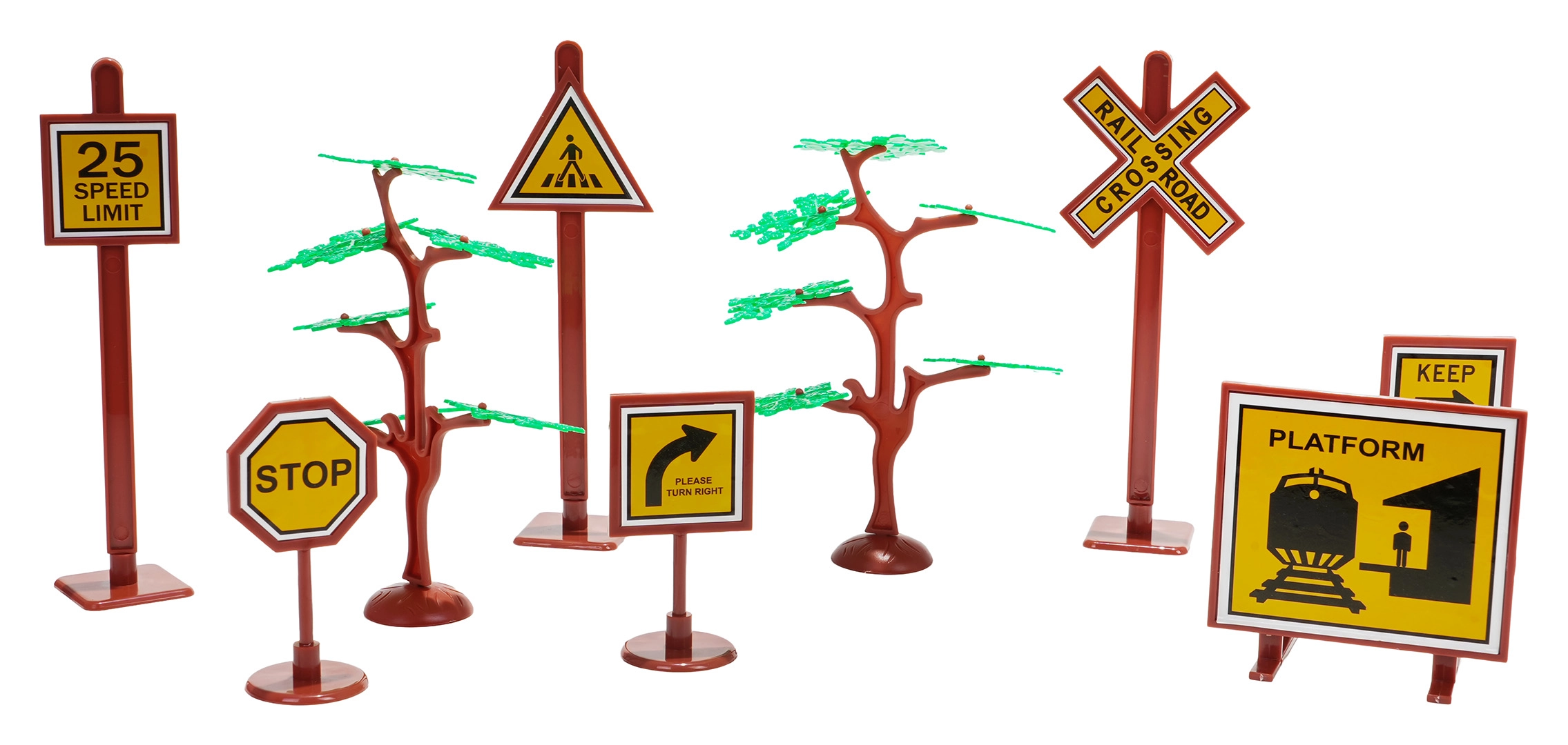 Im Set enthalten sind eine Lokomotive mit Tender, Personen- und Güterwagen, Schilder und Bäume – alles für kreatives Spiel.