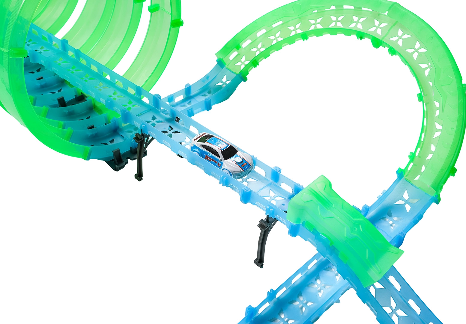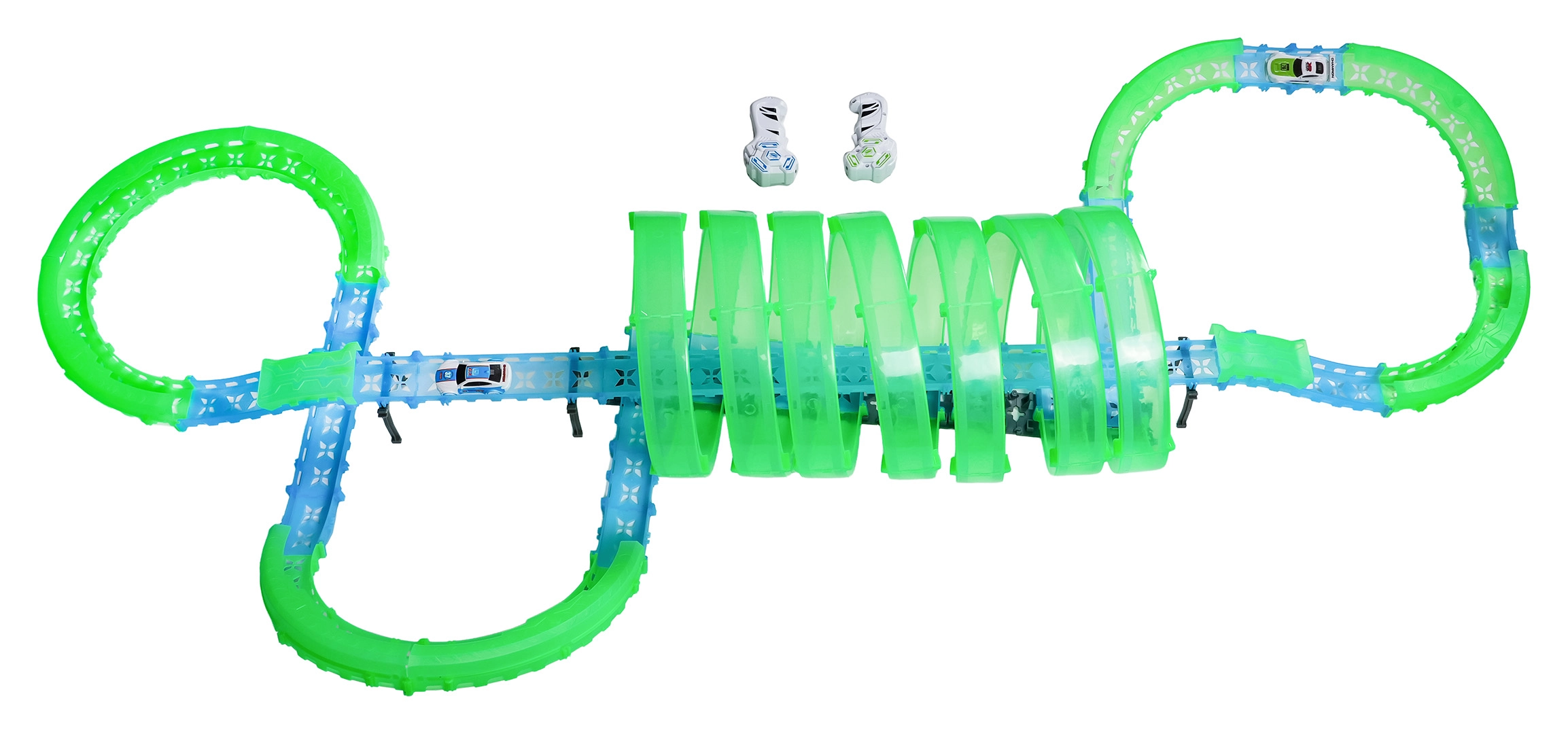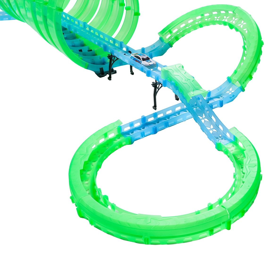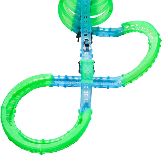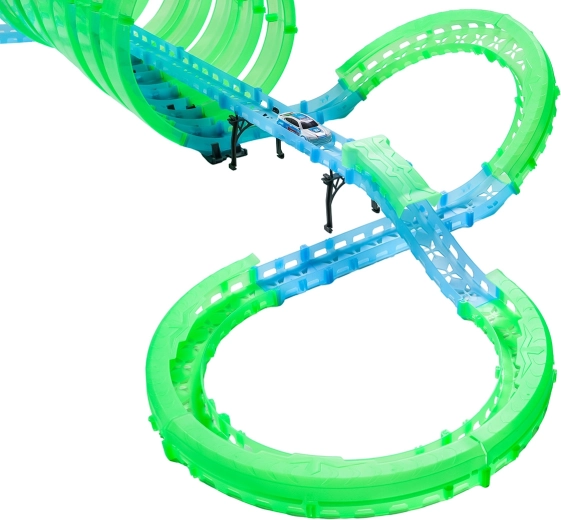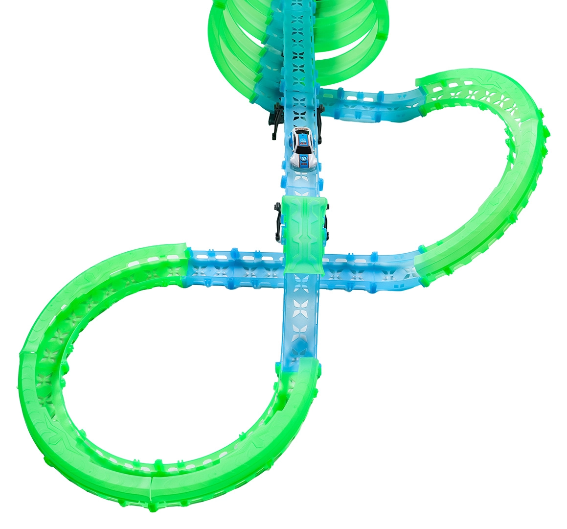 Diese modulare Rennstrecke aus lichtleitenden Teilen in Neon-Grün und Blau lässt sich leicht zusammenklicken und ermöglicht schnelle Umbauten. Das fluoreszierende Material strahlt nach dem Aufladen und verwandelt in Kombination mit den LED-Autos das Zimmer in eine fesselnde Lichtarena.