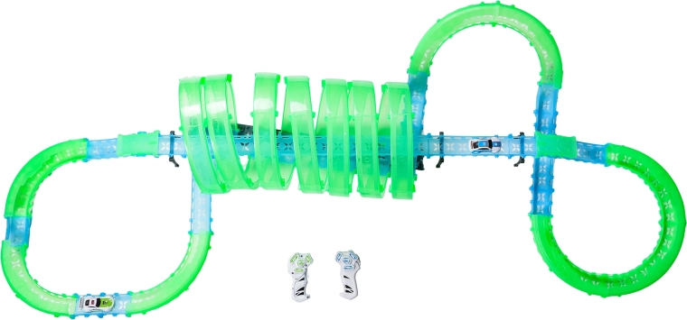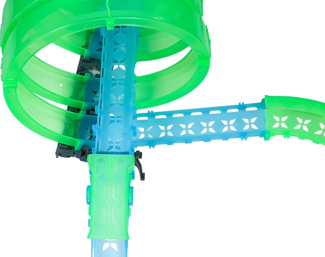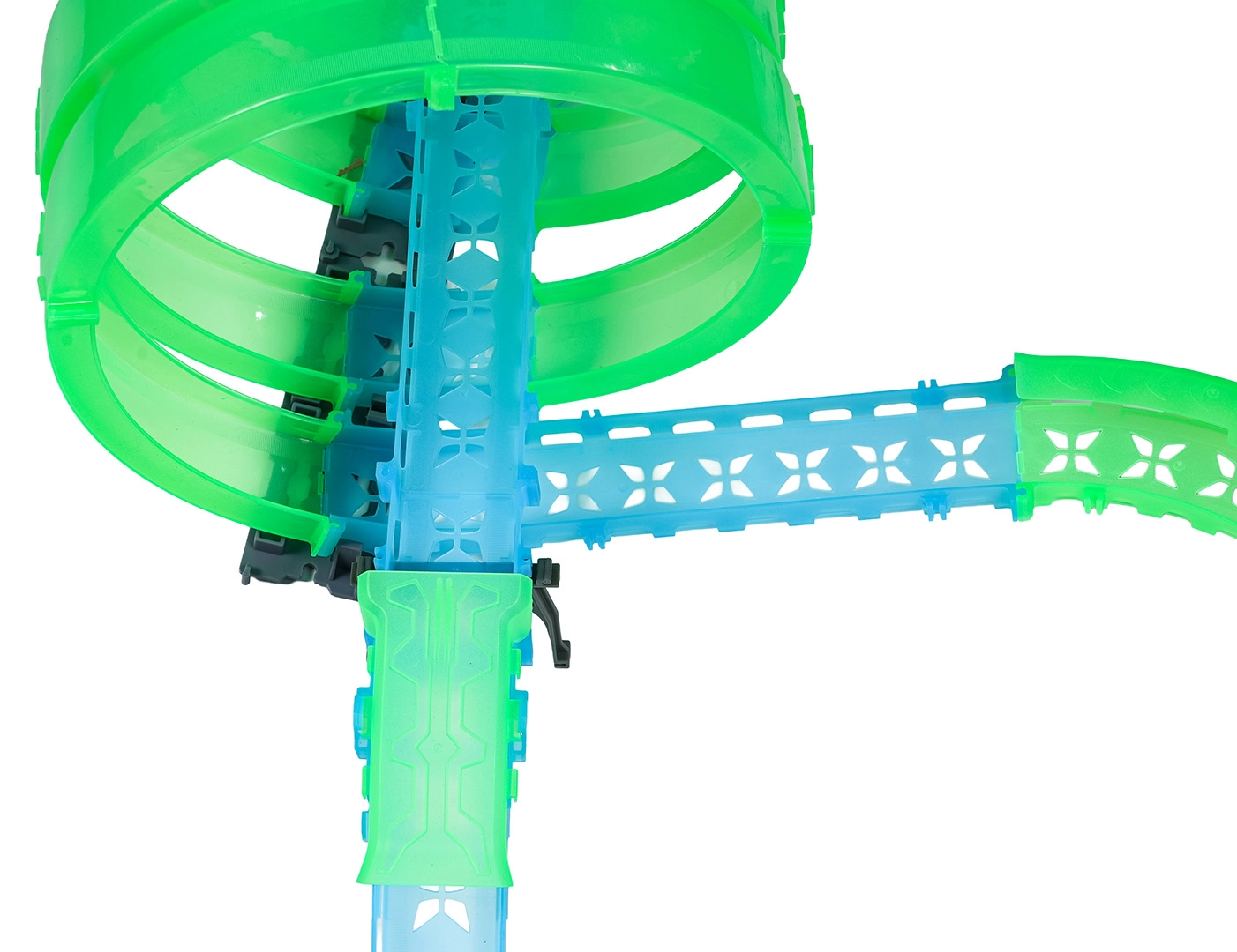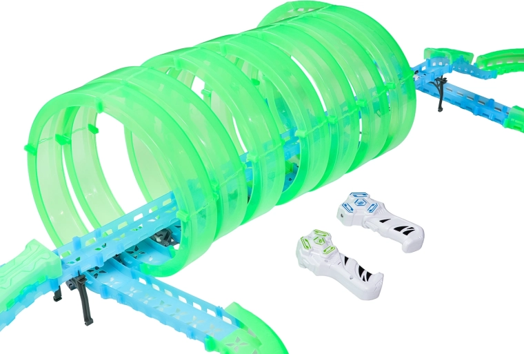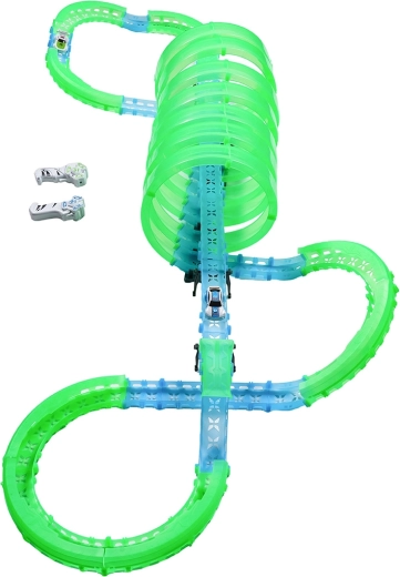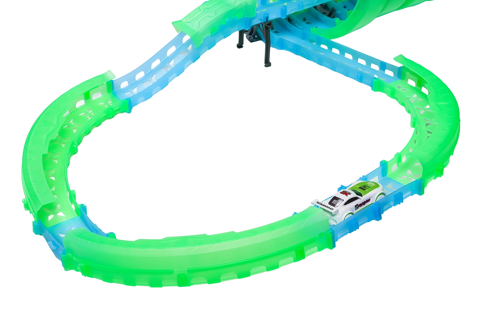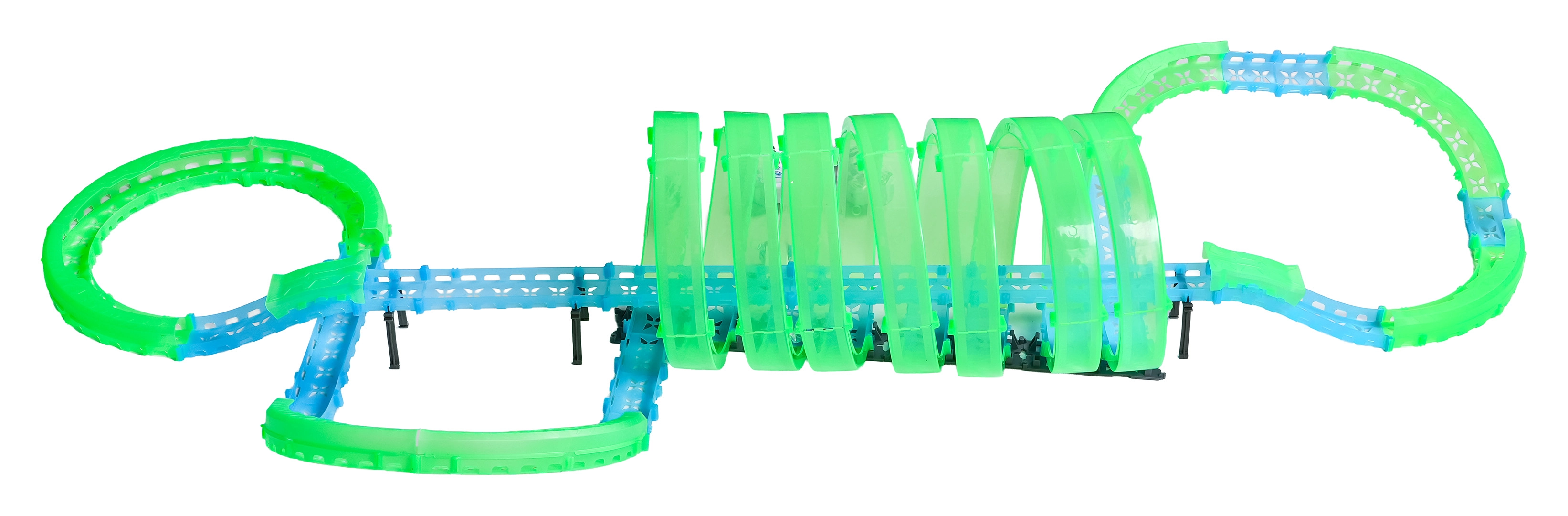 Diese modulare Rennstrecke aus lichtleitenden Teilen in Neon-Grün und Blau lässt sich leicht zusammenklicken und ermöglicht schnelle Umbauten. Das fluoreszierende Material strahlt nach dem Aufladen und verwandelt in Kombination mit den LED-Autos das Zimmer in eine fesselnde Lichtarena.