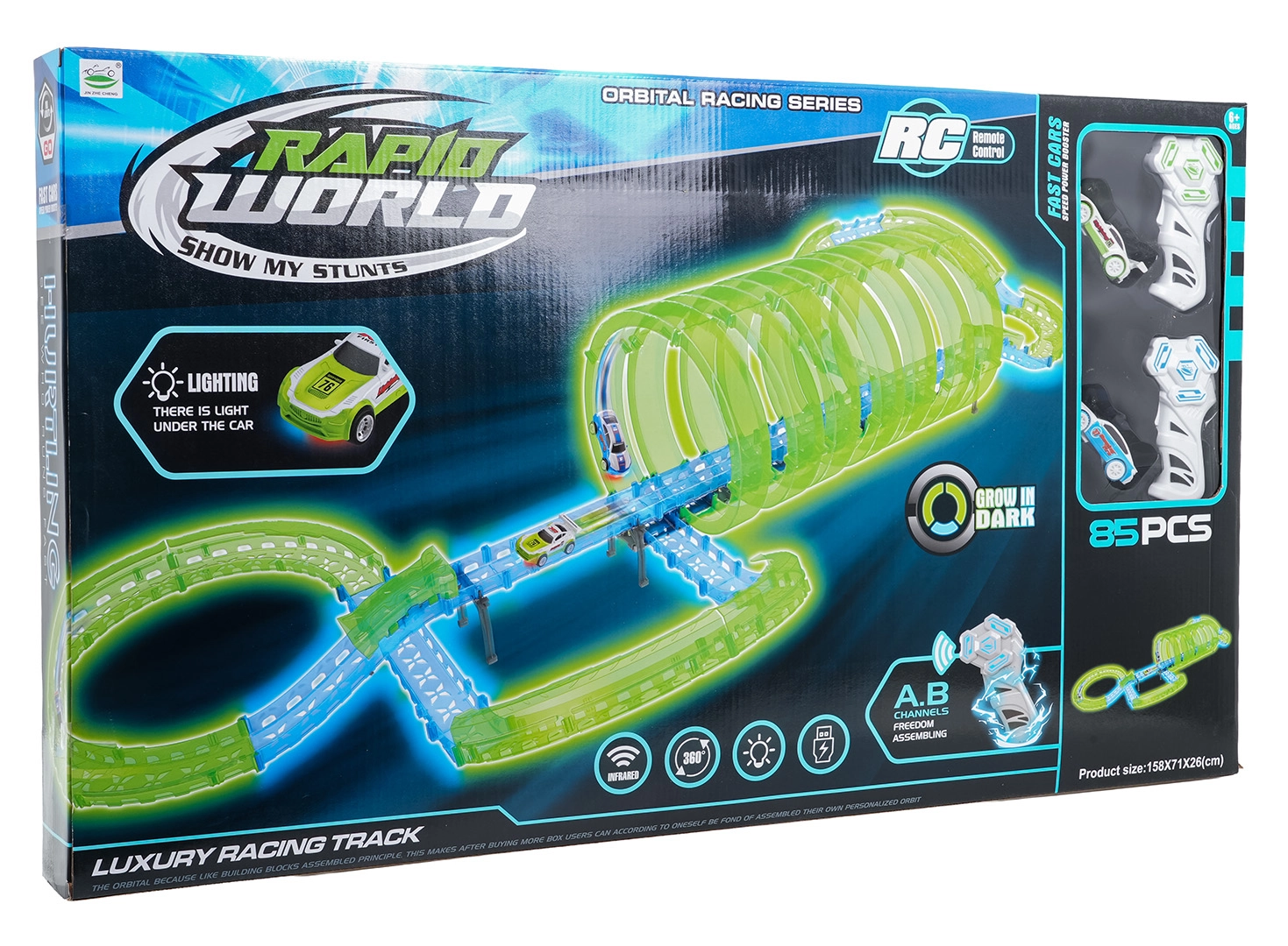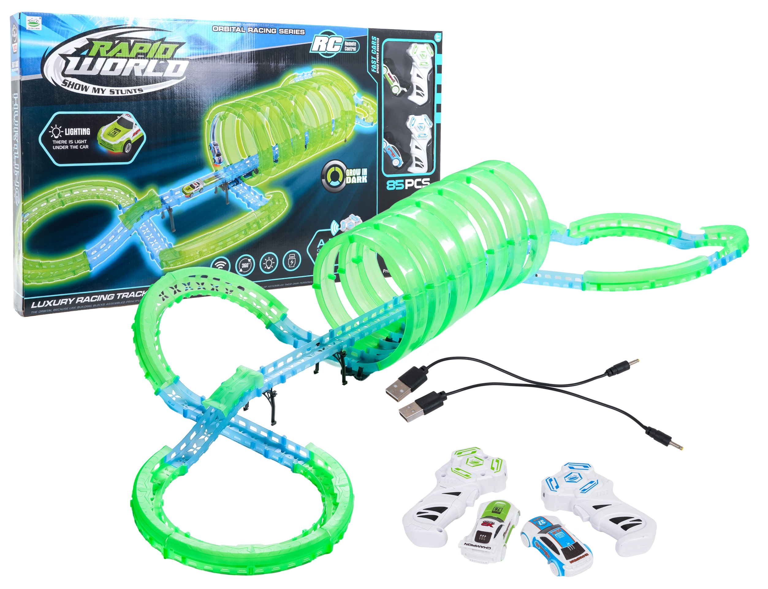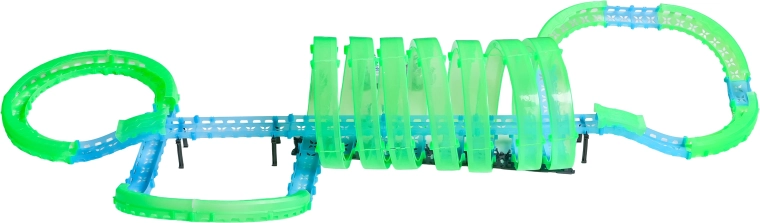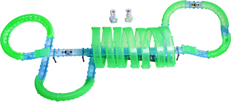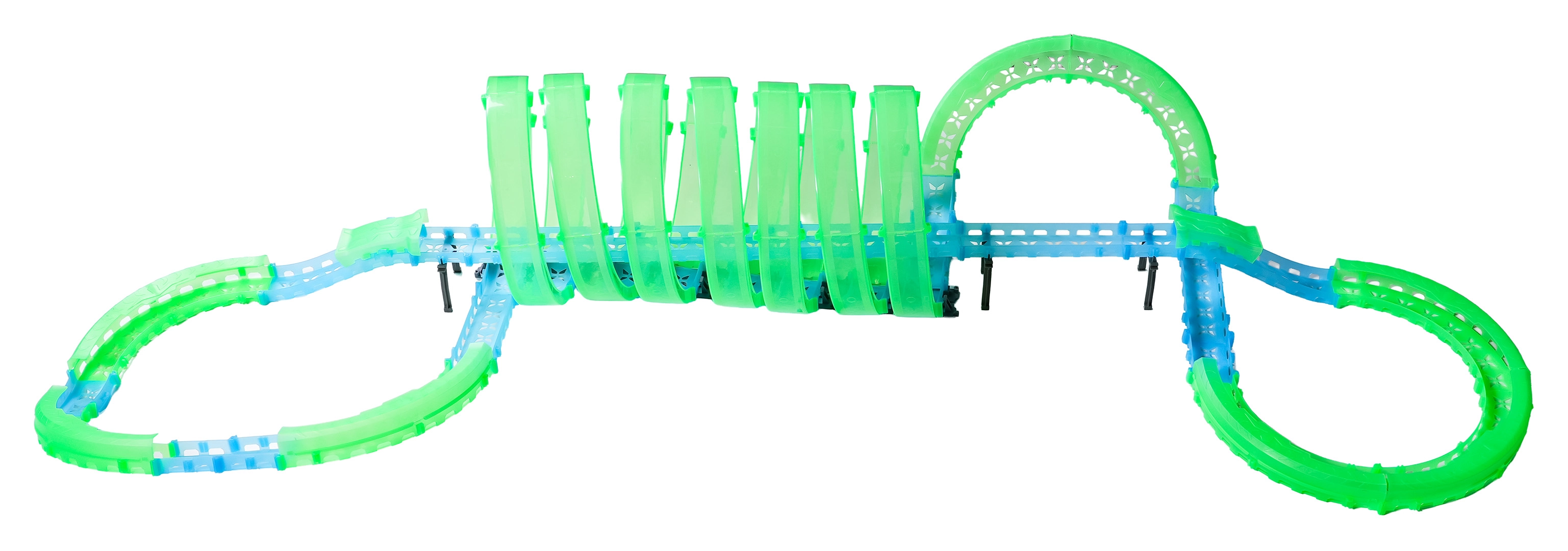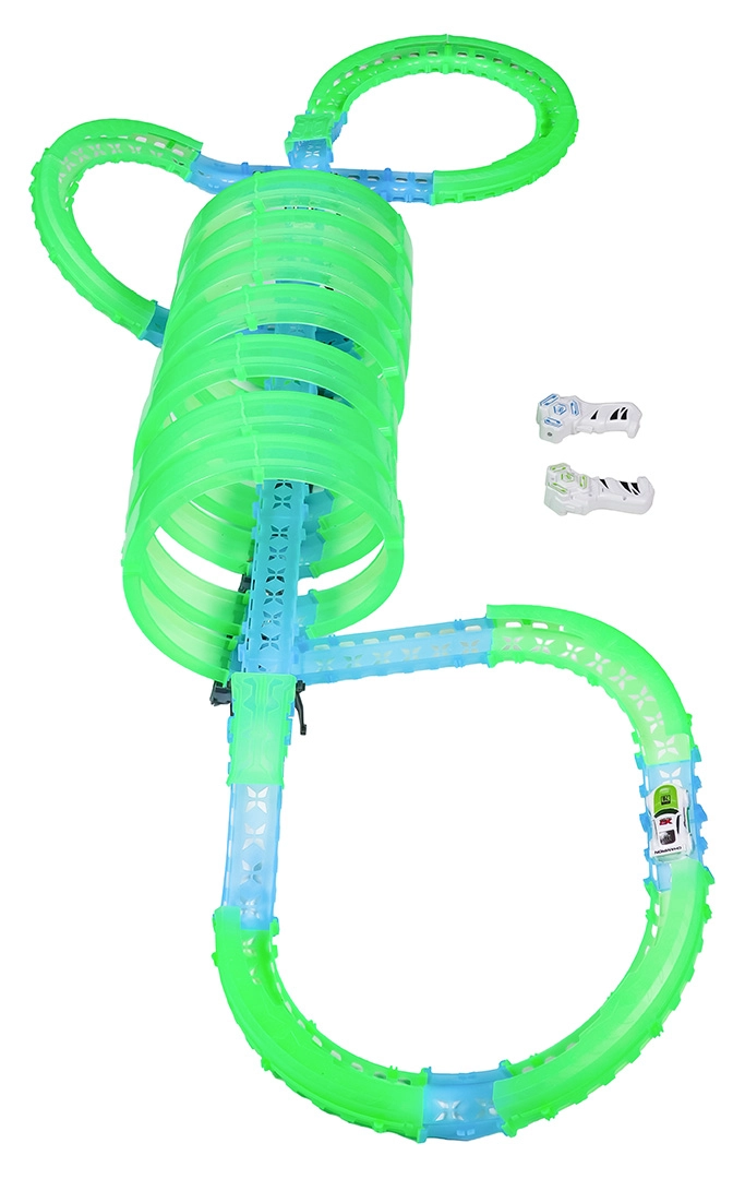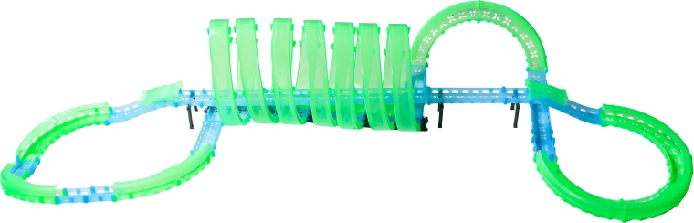 Diese modulare Rennstrecke aus lichtleitenden Teilen in Neon-Grün und Blau lässt sich leicht zusammenklicken und ermöglicht schnelle Umbauten. Das fluoreszierende Material strahlt nach dem Aufladen und verwandelt in Kombination mit den LED-Autos das Zimmer in eine fesselnde Lichtarena.