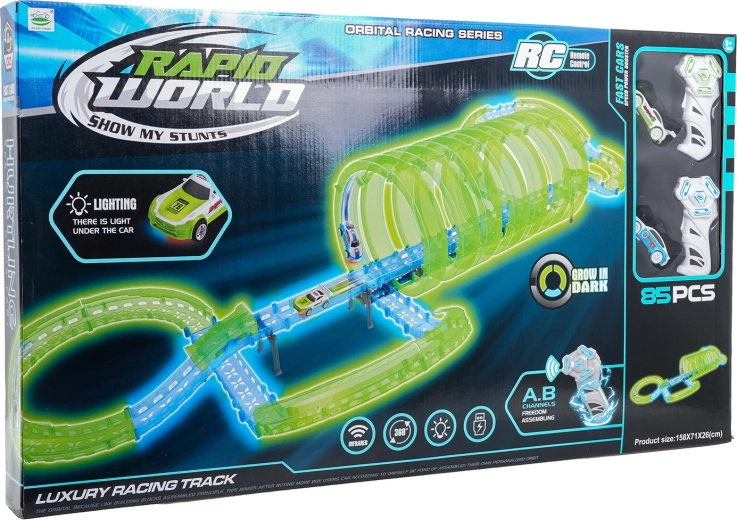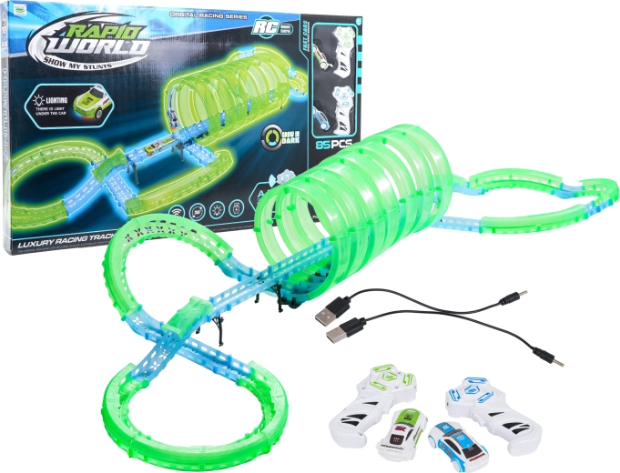 Fluoreszierende Streckenteile leuchten nach dem Aufladen mit Licht, und die LED-Beleuchtung der Autos hinterlässt während der Fahrt eine beeindruckende Lichtspur.