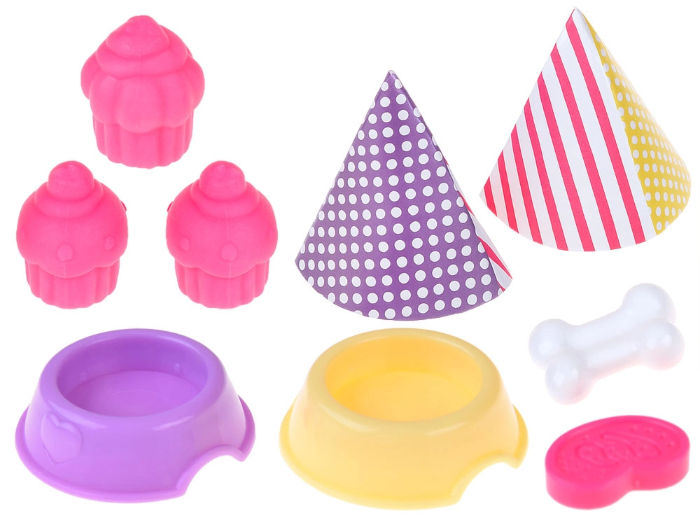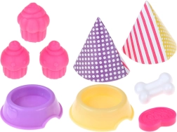 Das Set bietet eine bunte Auswahl an Zubehör für immer neue Geschichten: von Tisch und Stühlen über Näpfe für die Tiere, Besteck und Geschirr bis hin zu Papier-Partyhütchen. Alles ist leicht, liegt gut in Kinderhänden und ist bereit für stundenlange Rollenspiele.