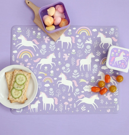 Die großzügigen Maße bieten ausreichend Platz für Teller, Besteck und Glas. Das pastellviolette Design mit Einhörnern und Regenbogen lässt den Kindertisch erstrahlen und sorgt für gute Laune beim Essen.