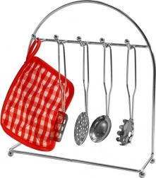 Pfanne; 3 Töpfe in verschiedenen Größen; 2 Deckel; 2 Becher; Ständer für Küchenutensilien; textile Unterlage für Geschirr; textiler Handschuh; 4 Löffel; Schneebesen; Schöpflöffel; Pfannenwender; Sieb; Pastalöffel; 2 flache Siebe