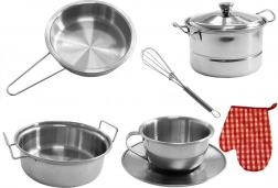 Komplettes Edelstahl-Küchenset für Kinder mit 23 Teilen für stundenlangen kreativen Spaß und Lernen. Enthält Pfännchen, Töpfe mit Deckeln, Utensilien und textile Accessoires – alles in metallischer Ausführung, passend für jede Kinderküche. Fördert Feinmotorik, Zusammenarbeit und Kreativität. Geeignet ab 3 Jahren, mit CE-Zertifikat und konform mit Norm EN 71.