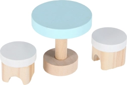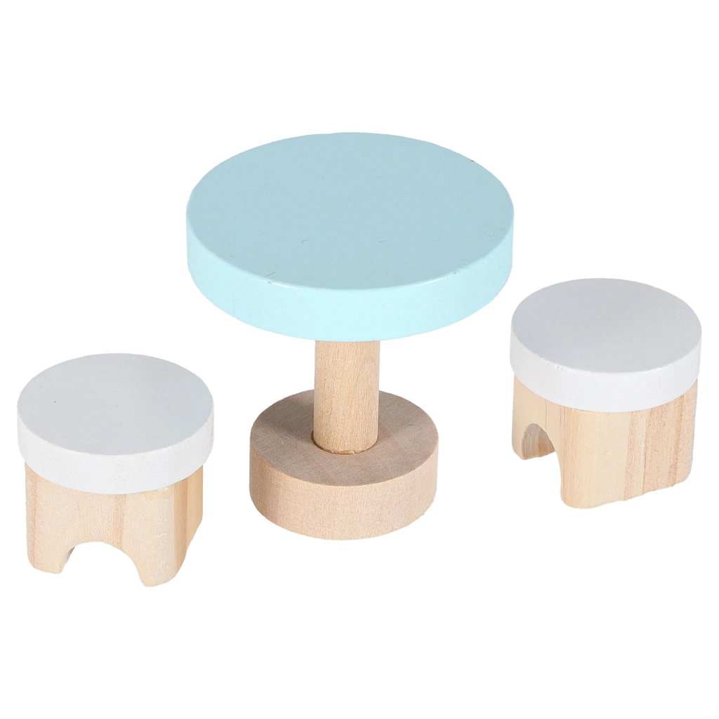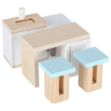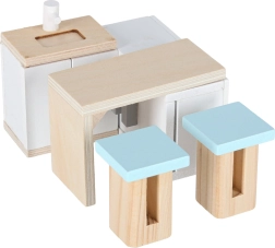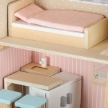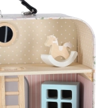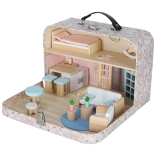 Dieses Mini-Puppenhaus im Koffer verwandelt sich nach dem Öffnen in ein zweistöckiges Interieur mit Küche, Wohnzimmer und Schlafzimmer. Zarte Pastellfarben in Kombination mit natürlichem Holz schaffen eine gemütliche Atmosphäre und laden zum Rollenspiel mit Puppen oder Figuren ein.