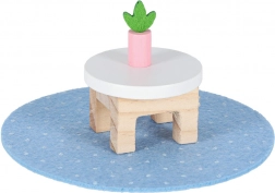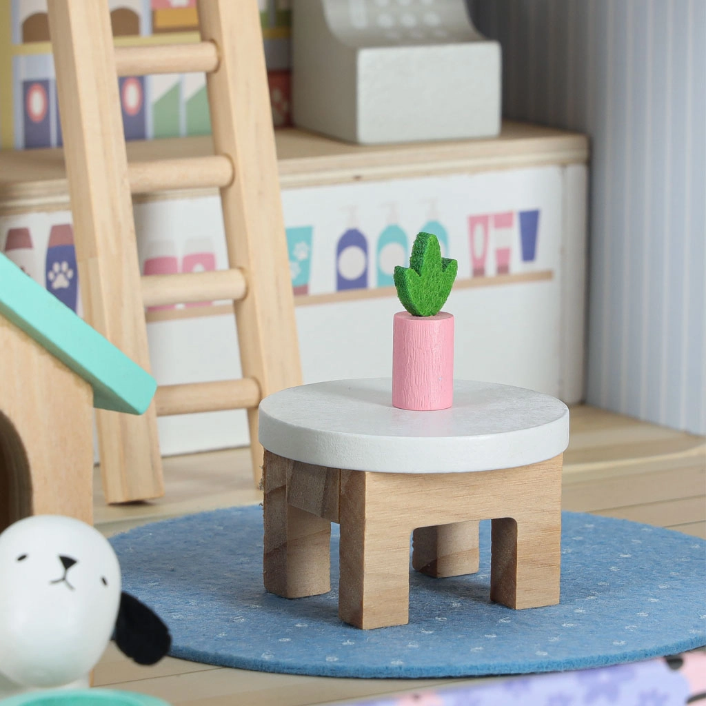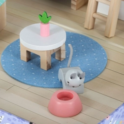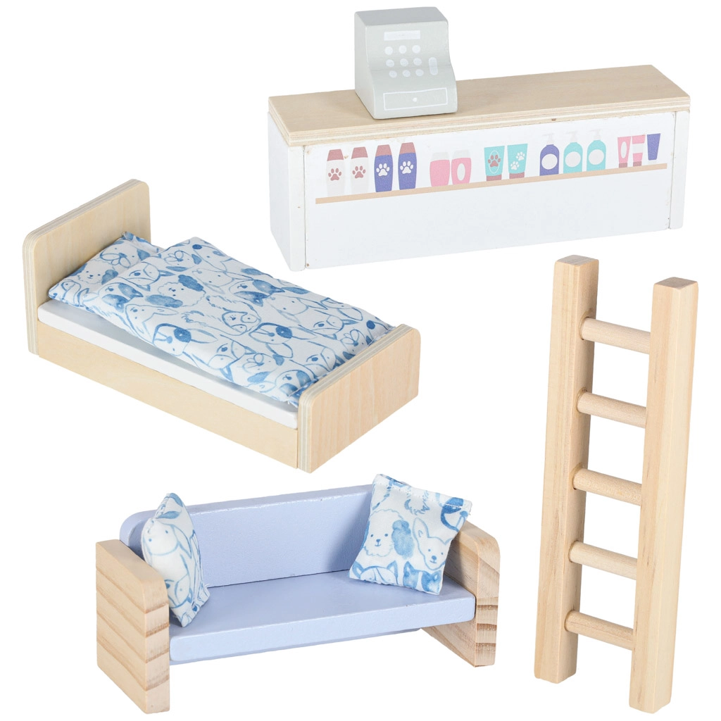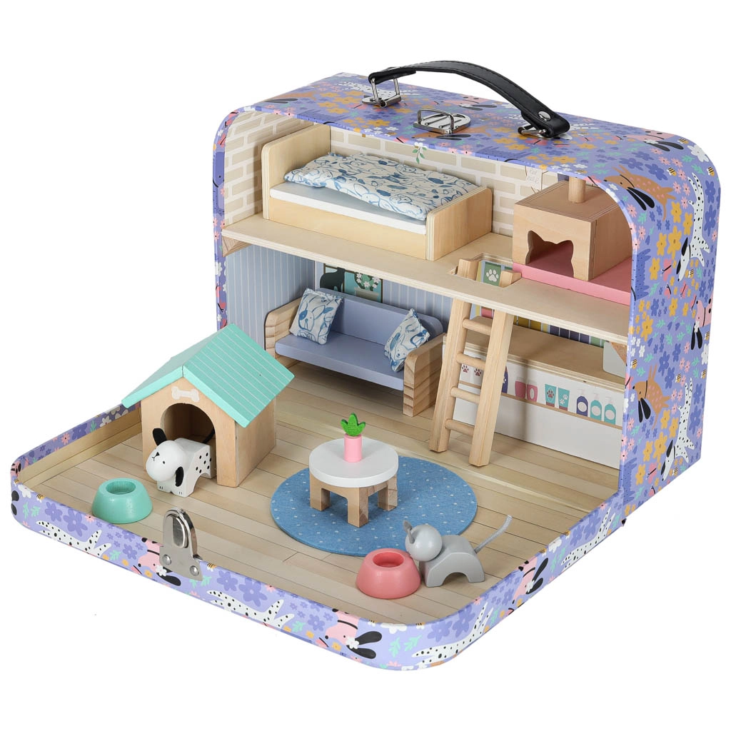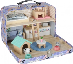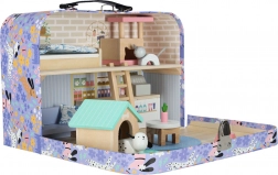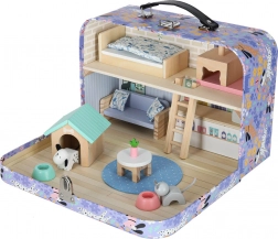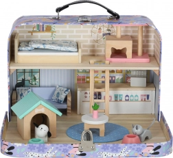 Zum Set gehören hochwertige Holzmöbel (Bett mit Bettzeug, Sofa, Tisch, Regal, Leiter), Elemente für einen Laden (Theke und Kasse) sowie eine Tier-Ecke mit Hundehütte, Kratzbaum für die Katze und zwei Näpfen. Dank des Koffer-Designs nehmen Sie das Spielzeug leicht mit zu Besuch, in den Urlaub oder auf den Spielplatz – und nach dem Spiel ist alles schnell verstaut.