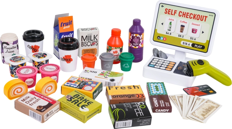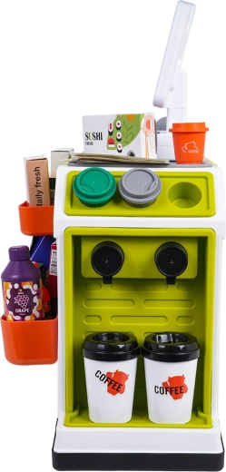 Das Set besteht aus hochwertigem, widerstandsfähigem Kunststoff in lebendigen Farben. Enthalten sind eine Kaffeemaschine mit Kapseln und Bechern, zahlreiche „Lebensmittel“-Verpackungen und praktische Fächer für eine übersichtliche Organisation. Der Scanner bietet Licht- und Soundeffekte, die Kasse erzeugt Töne beim Drücken der Tasten und bei der Kartenzahlung.