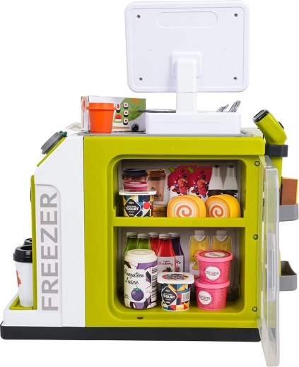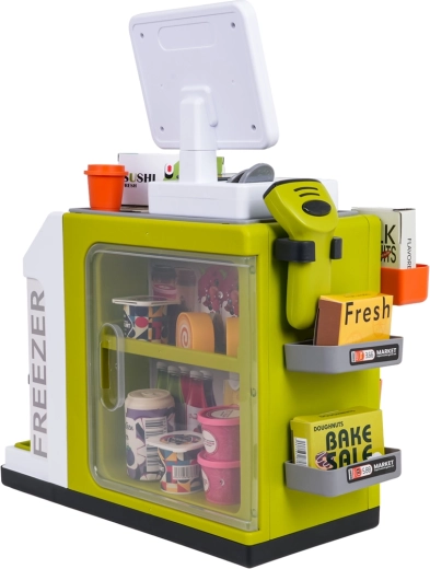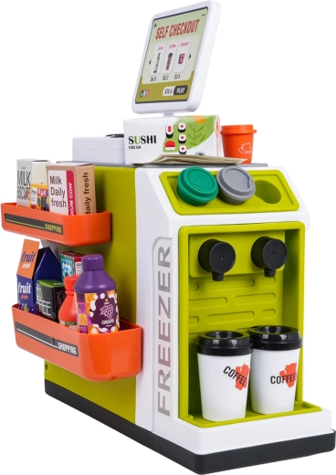 Der Kinder-Mini-Supermarkt ist die ideale Wahl für kreatives Spielen und die Förderung sozialer Kompetenzen. Dank Selbstbedienungskasse mit Geräuschen, Licht-Scanner und simulierter Kartenzahlung erleben Kinder ein authentisches Einkaufserlebnis. Bunte Regale, umfangreiches Zubehör und ein zu öffnender Kühlschrank/Gefrierschrank regen die Fantasie an und vermitteln Grundlagen des Zählens, Sortierens und Rollenspiels.
