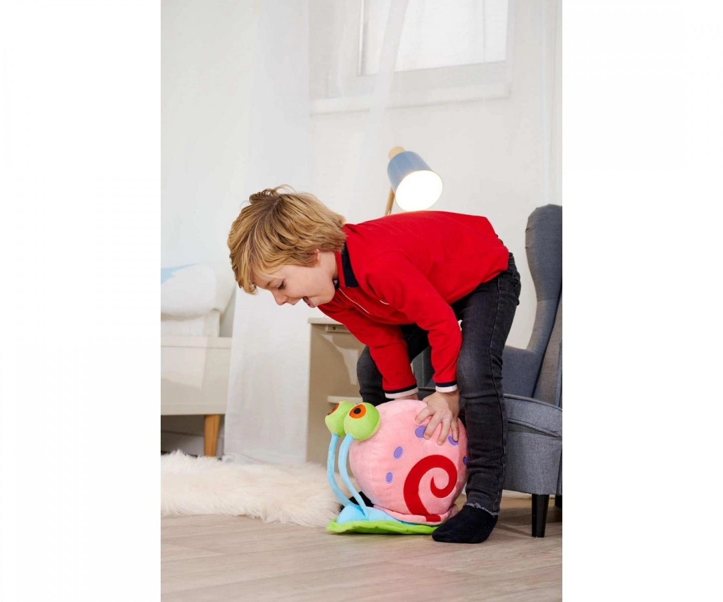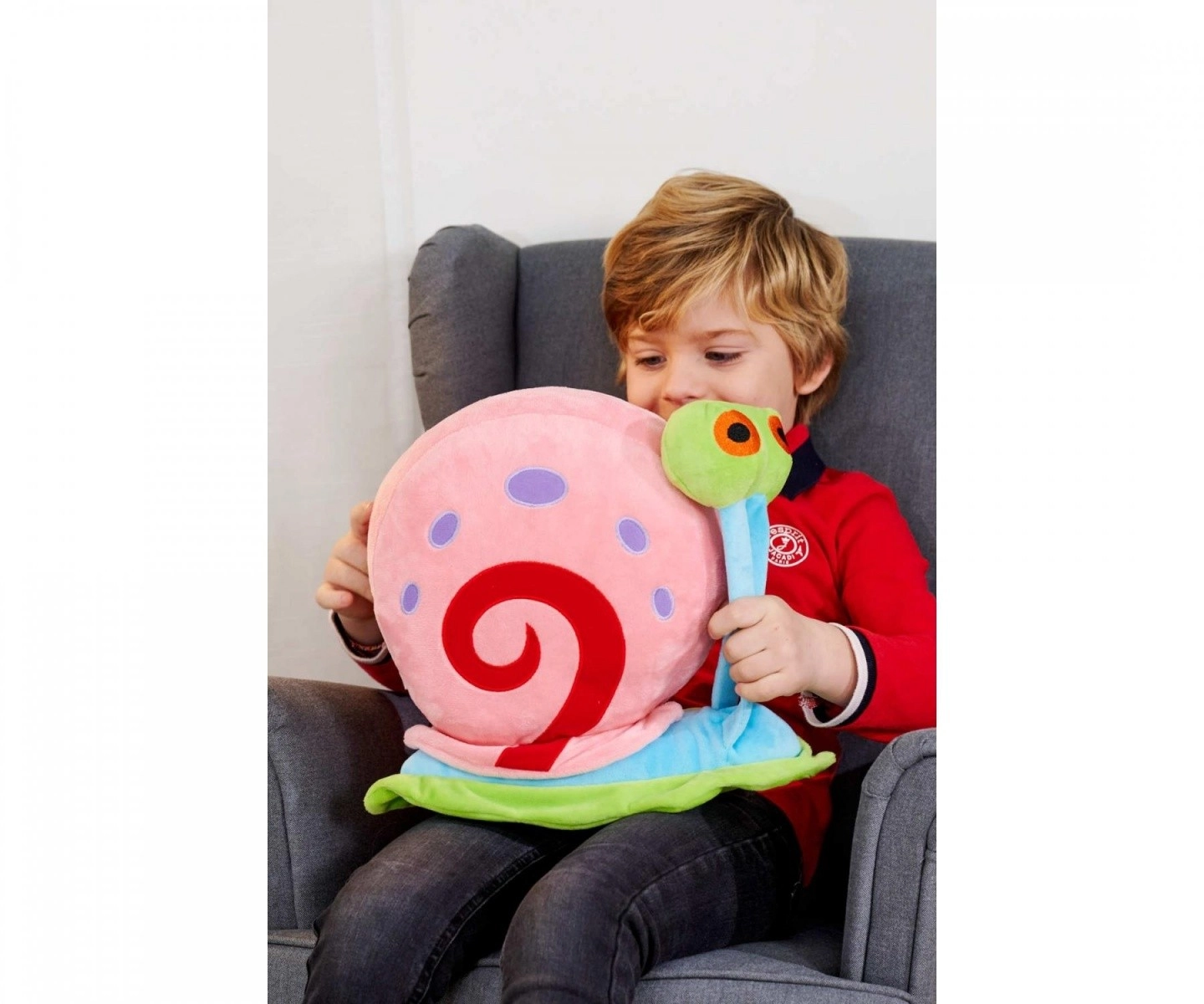 Rosa Schneckenhaus mit roter Spirale, violette Punkte und große grüne Augen – genau wie in der beliebten Serie.