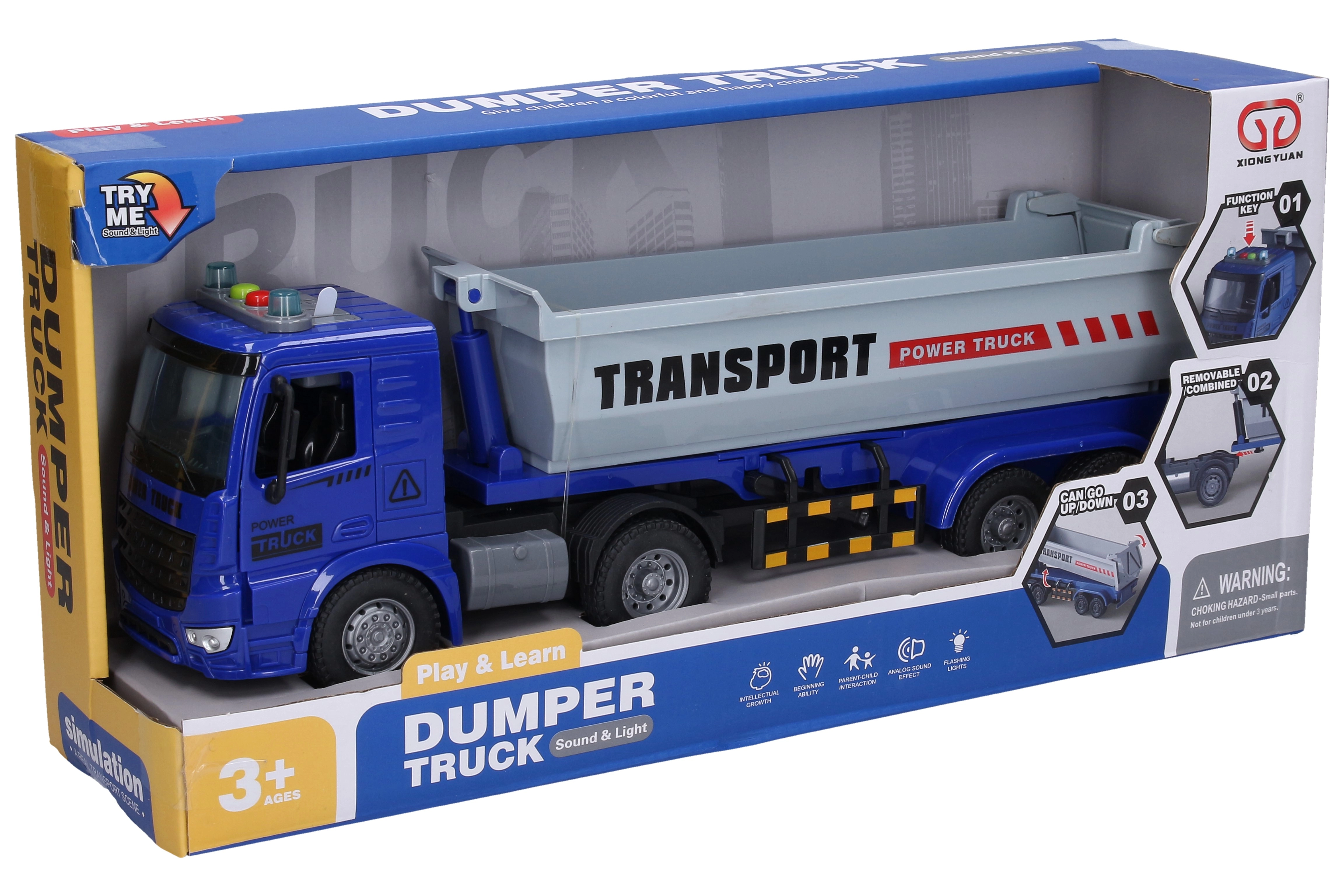 Einfach drücken: Taste 1 startet Motorsound und Kippen, Taste 2 aktiviert Rückfahr- und Hupgeräusch. Der abnehmbare Anhänger erweitert die Spielmöglichkeiten – fahren Sie mit oder ohne Anhänger. Batterien sind im Lieferumfang enthalten, sodass der Spaß sofort beginnen kann.