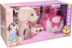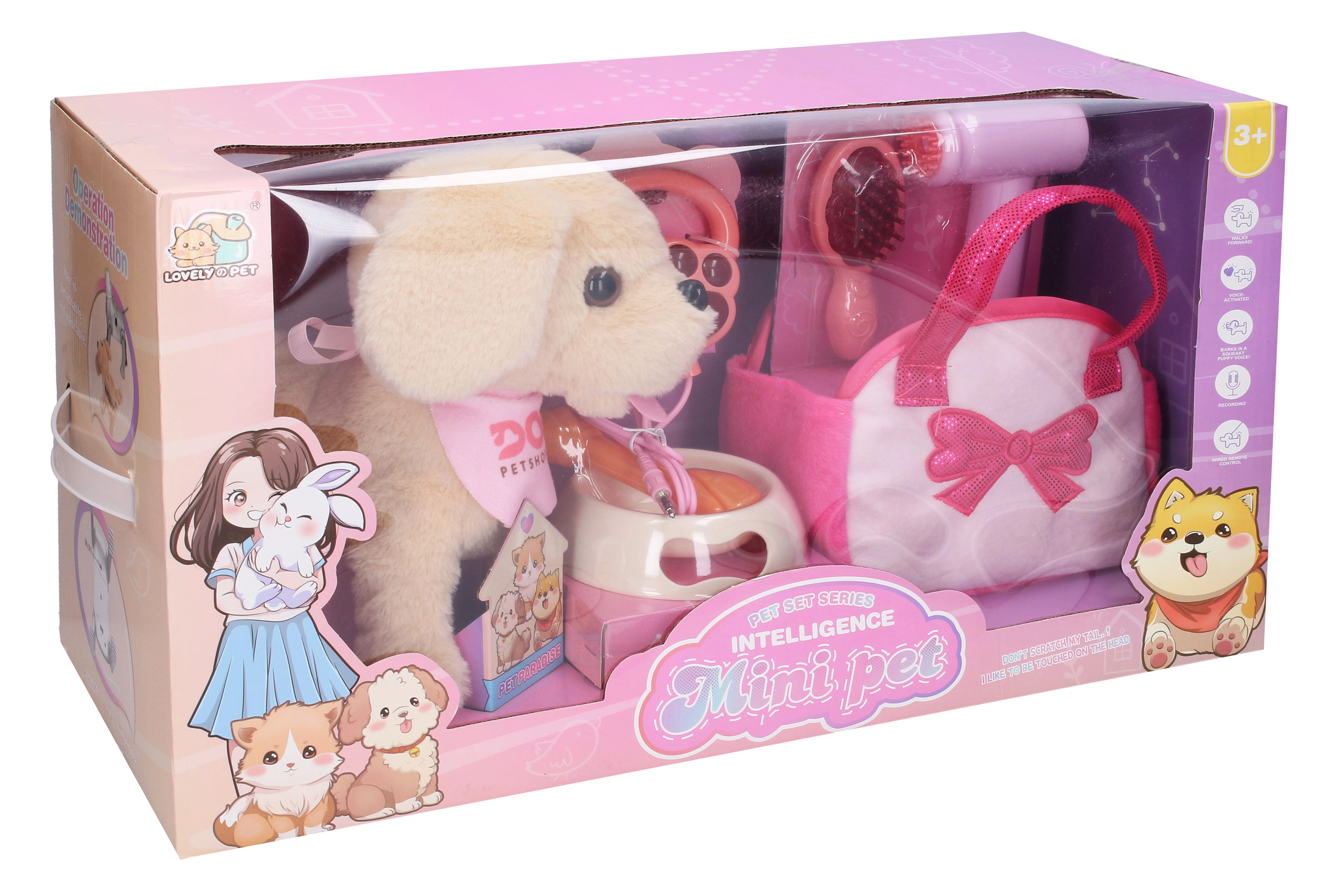Lieferumfang: Interaktiver Hund (ca. 25 cm), Schüssel, Knochen, Bürste, Föhn und Tasche. Betrieb mit 3× AA-Batterien (nicht enthalten). Schalter ON/OFF an der Unterseite des Hundes. Kabelgebundene Steuerung für einfache Nutzung.