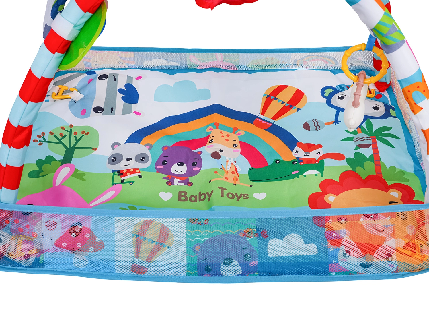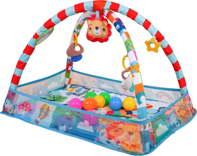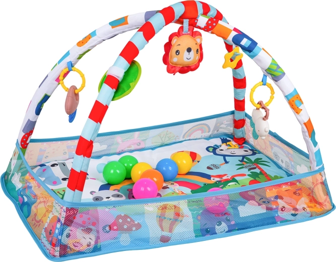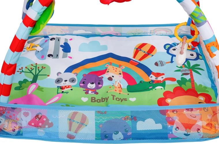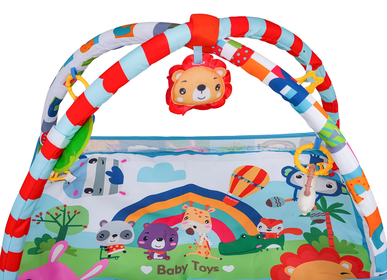 Der abnehmbare Spielbogen mit Hängespielzeug (sicherer Spiegel, Spielzeuge mit Rasseln und Beißringen, Plüschlöwe mit Quietsche u. a.) animiert das Kind zum Strecken, Greifen und Entdecken. Die Matte besteht aus sicheren, leicht abwischbaren Materialien, hat leuchtende Farben und eine stabile Konstruktion für tägliches Spielen.