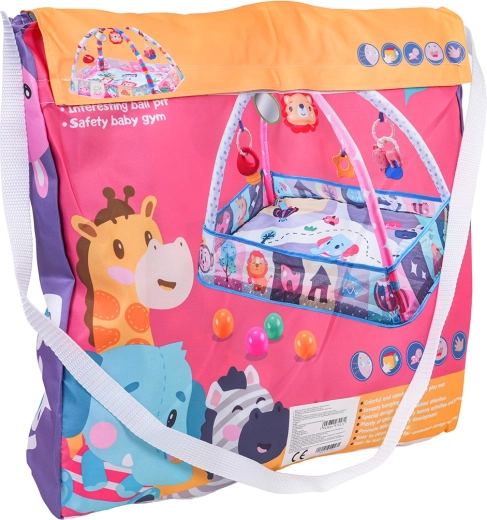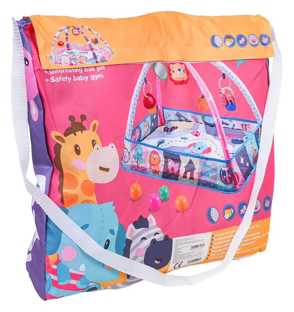 Im Lieferumfang: Matte mit Hängespielzeug, 8× Kunststoffball für das Trockenspielbecken und eine farbige Umhängetasche für einfaches Tragen und Aufbewahren.