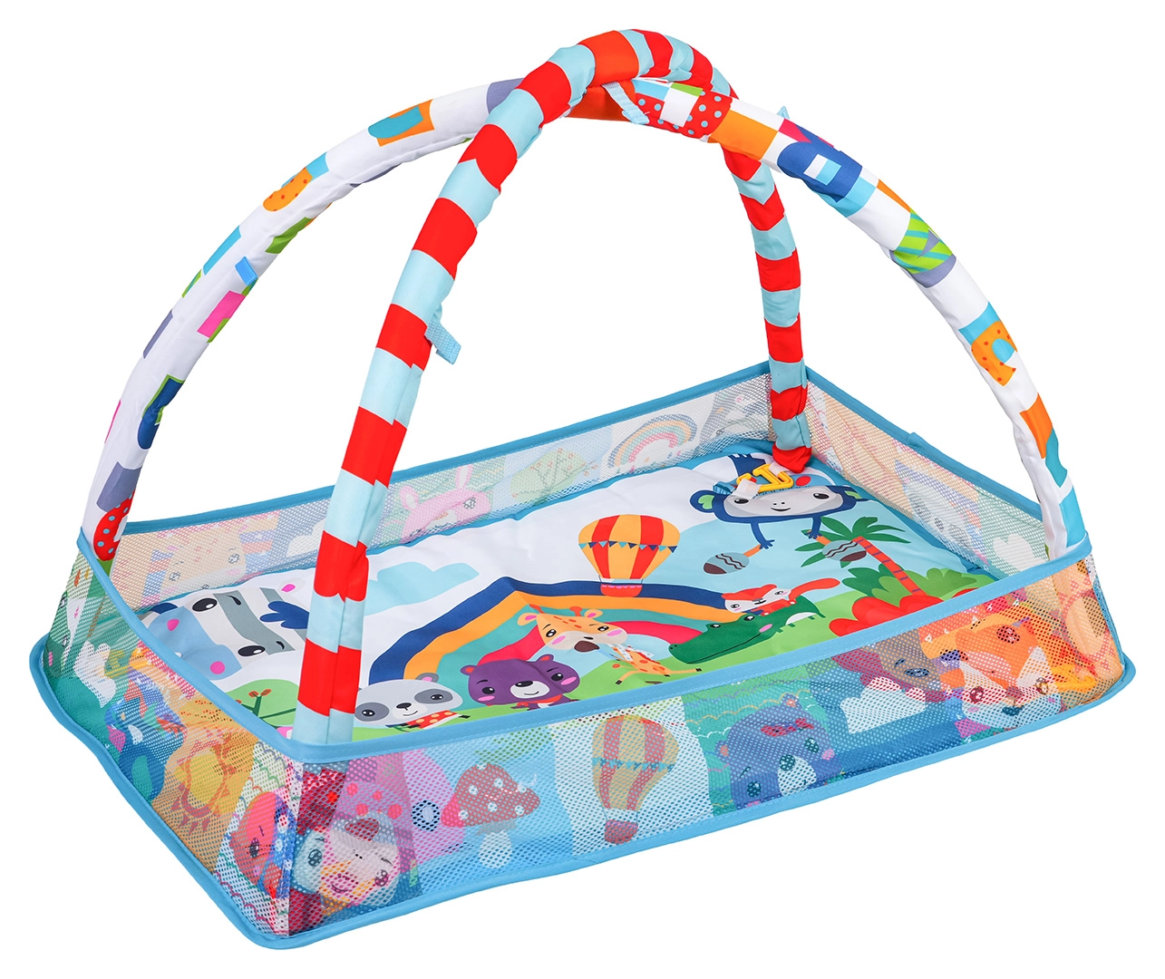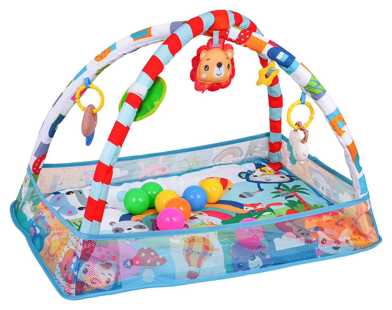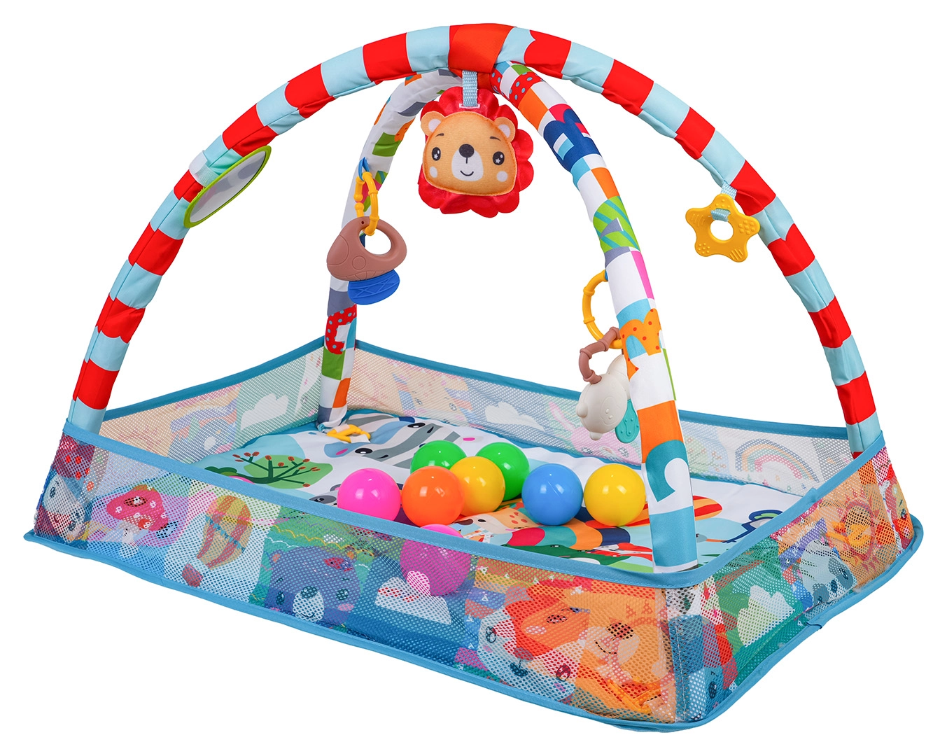 Diese farbenfrohe Spieldecke schafft eine sichere, anregende Umgebung zur Förderung der Sinne und Motorik ab den ersten Tagen. Dank der Netzseiten bleiben Spielzeuge und Bälle an Ort und Stelle, und das Baby hat einen ruhigen Bereich zum Liegen auf dem Rücken sowie für Tummy Time.