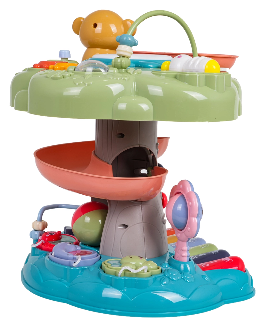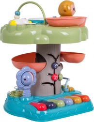 Der interaktive Baum ist ein ideales Lernspielzeug für die Kleinsten. Kinder werden vom beleuchteten Musiktrommel an der Spitze, dem Klavier mit vier Modi (Zahlen, Melodien, Tiere und ihre Geräusche, Töne) sowie der spiralförmigen Bahn für Kugeln begeistert, auf der die Bälle fröhlich nach unten rollen. Bunte Elemente, Lichter und Melodien unterstützen die sensorische Entwicklung und das Lernen von Ursachen und Folgen.