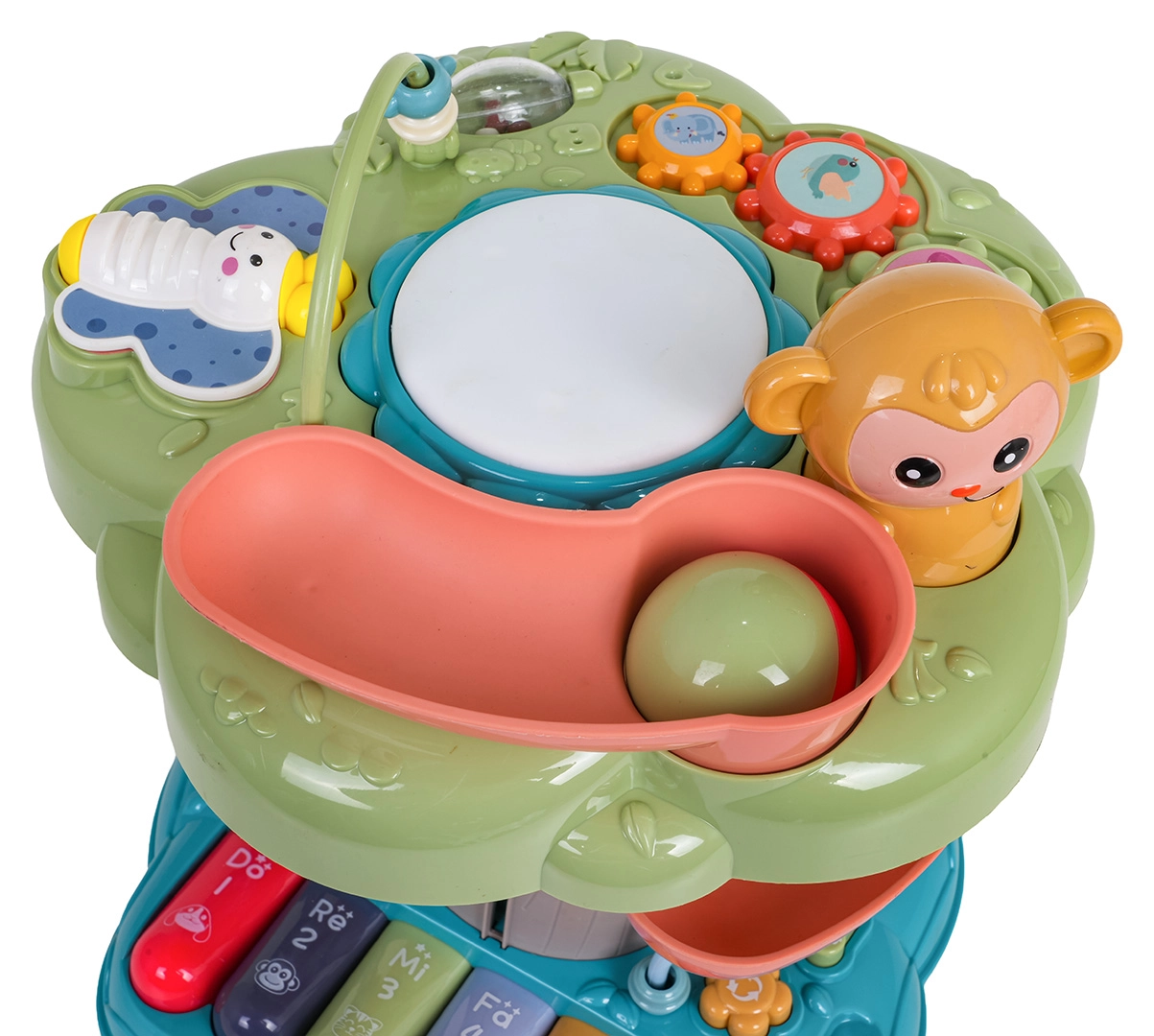 Nicht fehlen dürfen ein Perlenlabyrinth, Zahnräder, herausnehmbare Rasseln und Tierchen an einer Schnur zum Formenpaaren. Kinder können Tasten drücken, drehen, verschieben und trommeln – jede Aktion löst einen Ton oder ein Licht aus. Das Spielzeug besteht aus robustem Kunststoff ohne scharfe Kanten und ist für sicheres Spielen zu Hause konzipiert.