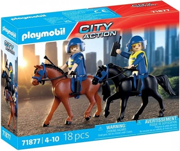Entdecken Sie die dynamische Welt der städtischen Streife mit dem PLAYMOBIL Reiterduo. Das Set bietet detaillierte Figuren einer Polizistin und eines Polizisten in blauen Uniformen sowie zwei Pferde (braun und schwarz) mit kompletter Ausrüstung. Kinder genießen realistische Szenarien dank beweglicher Gelenke, abnehmbarer Helme und Westen und authentischem Zubehör wie Funkgerät und Gerte.