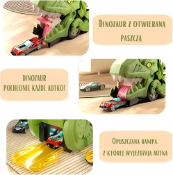Der Dinosaurier-Sattelzug verwandelt sich im Handumdrehen in einen Action-Spielplatz: Klappen Sie die orange Rampe aus, laden Sie die Autos auf und lassen Sie sie aus dem geöffneten Dinosauriermaul starten. Dank des praktischen Tragegriffs und der inneren Fächer verstauen Sie alle Fahrzeuge mühelos und nehmen sie überallhin mit. Kräftige Farben und markante Details fördern die Fantasie und laden zum Spielen ein.