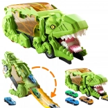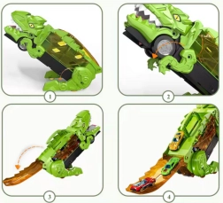 Öffnen Sie den Dinosaurierkopf und lassen Sie die orange Rutschbahn herunter. Die Autos rollen sanft hinaus und das Rennen kann beginnen.