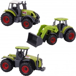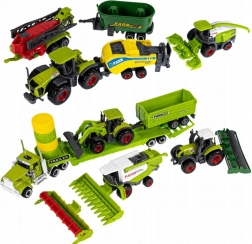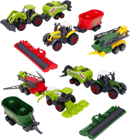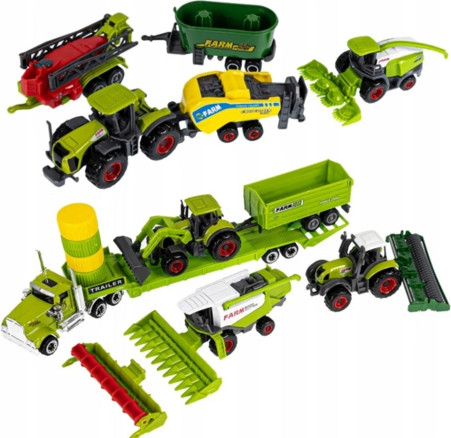 Enthalten sind verschiedene Traktortypen, ein Mähdrescher mit abnehmbarem Vorsatz, Anhänger und Aufsätze für vielfältige Spielszenarien. Figuren von Nutztieren runden die realistische Atmosphäre ab und unterstützen das Erfinden eigener Geschichten.