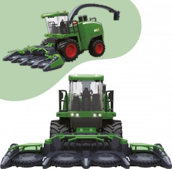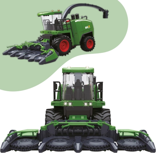 Das vordere Schneidwerk dreht sich während der Fahrt automatisch und kann in die Transportposition geklappt werden. Große Räder, Fahrerkabine und Scheinwerfer verleihen dem Modell ein authentisches Aussehen.