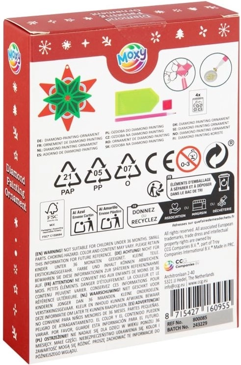 Lieferumfang: 1 Weihnachtsanhänger mit klebender Oberfläche (Mix aus 3 Motiven), farbige Diamantsteinchen, Stylus, Wachsmaterial und Schälchen zum Sortieren der Steinchen.