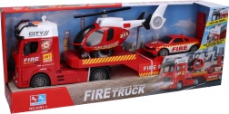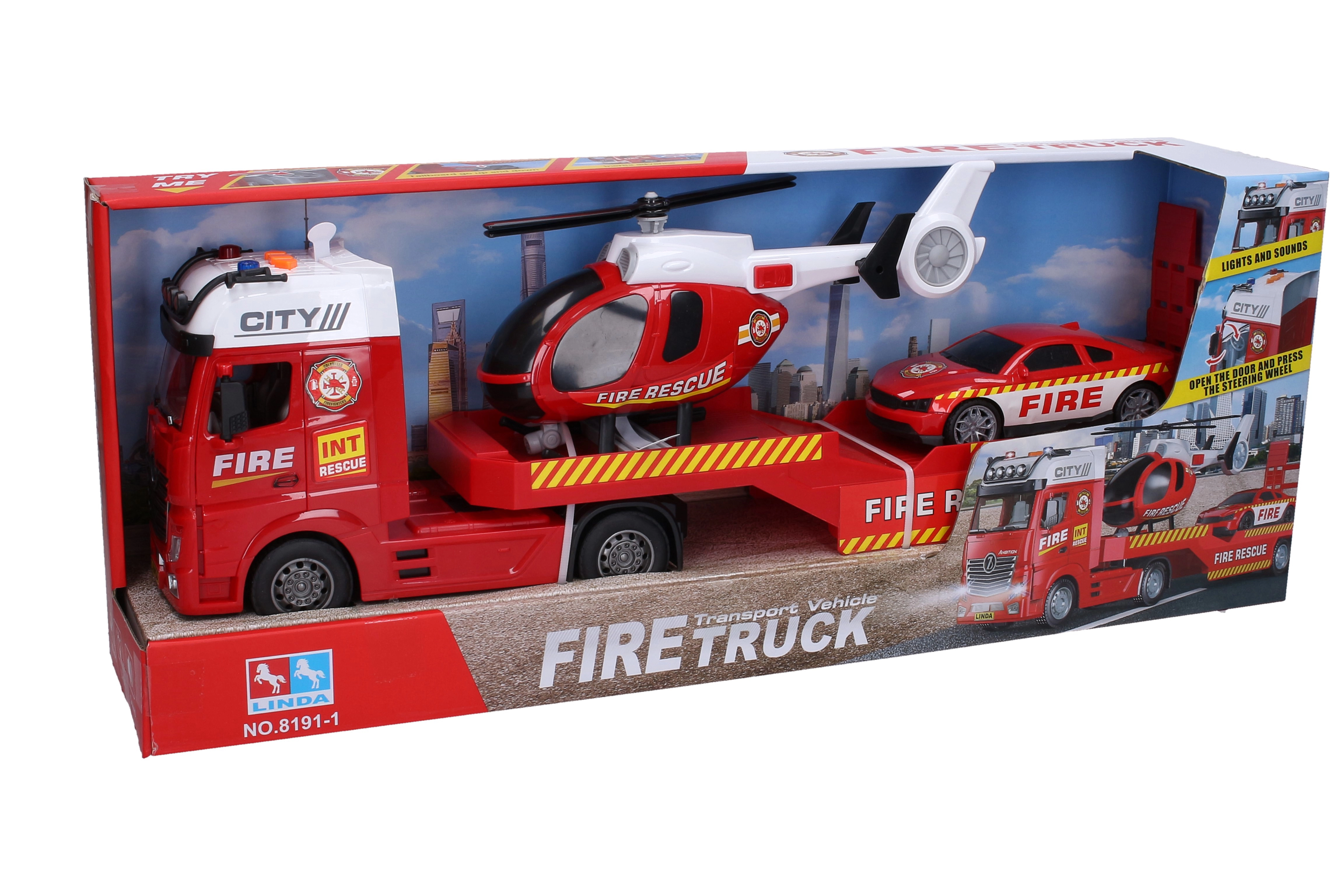 Erleben Sie Action wie bei der echten Feuerwehr! Dieses detaillierte Set kombiniert einen langen Sattelschlepper, einen Hubschrauber und ein Einsatzfahrzeug. Dank des Schwungrads fährt der Sattelschlepper leicht an, und für ein realistisches Erlebnis sorgen Blaulicht, Sirene, Rückfahr- und Motorgeräusch, die über Tasten auf dem Dach aktiviert werden. Der Hubschrauber verfügt über eigene Soundeffekte, gesteuert über eine Taste an der Seite.