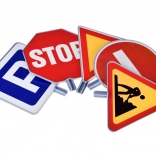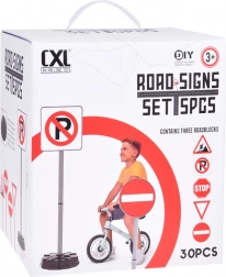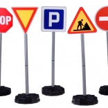Einfache Steckmontage aus Rohren und Verbindern. Im Set sind fünf beliebte Schilder enthalten: STOP, Vorfahrt gewähren, Parkplatz, Einfahrt verboten und Baustelle.