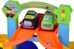 Der doppelte Startturm mit „Starting Point“ und Hebel lässt zwei Autos gleichzeitig losfahren. Kinder erleben einen spannenden Start und können Seite an Seite um die Wette fahren.