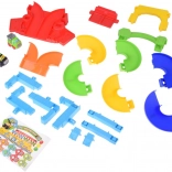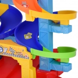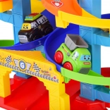 Bunte, gewundene Strecken führen die Autos sicher nach unten. Stabile Stützen und breite Seitenbegrenzungen sorgen für eine gleichmäßige Fahrt ohne Hängenbleiben.