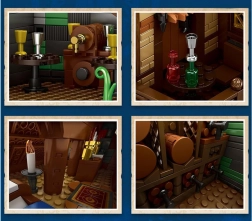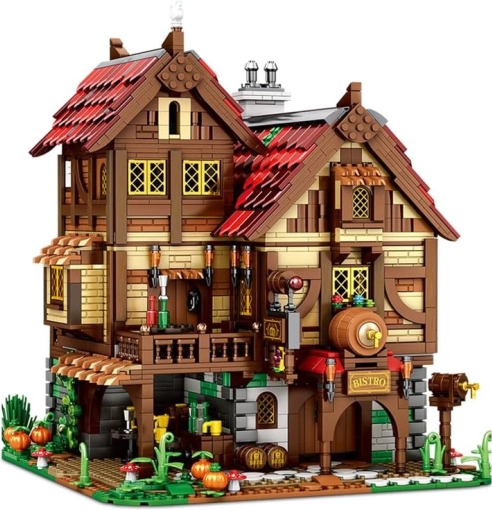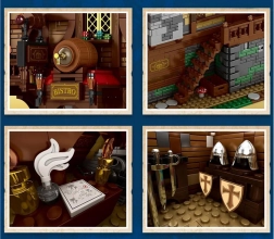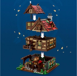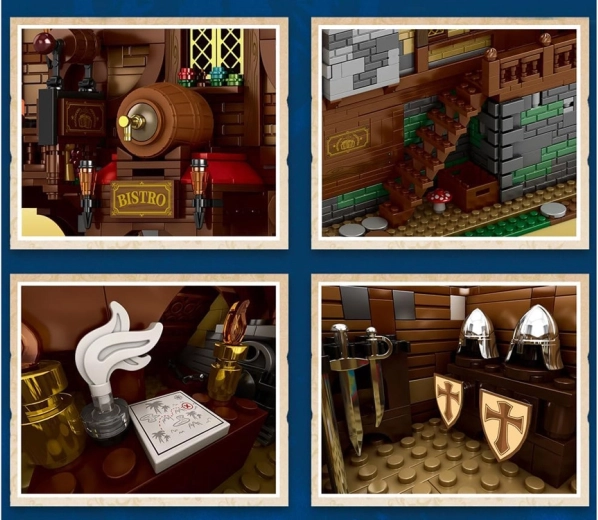 Dieses große mittelalterliche Haus/diese Taverne ist der ideale Ort für Ritter und Adelige nach anstrengenden Feldzügen. Freuen Sie sich auf einen reich ausgestatteten Innen- und Außenbereich, vom Fass mit „gezapftem Bier“ über Tische mit Kelchen bis hin zur Waffenkammer mit Schwertern und Schilden. Dank der 2868 Teile bauen Sie ein detailreiches Gebäude mit mehreren Ebenen und Dekorationen, die Fantasie und Geschichtenerzählen anregen.