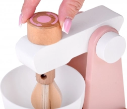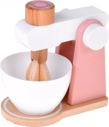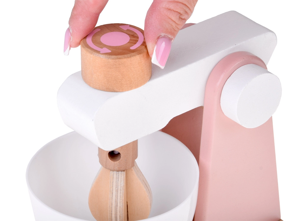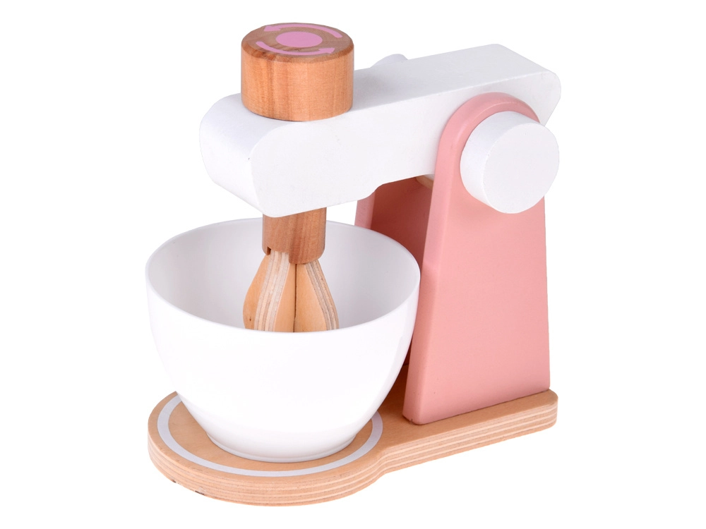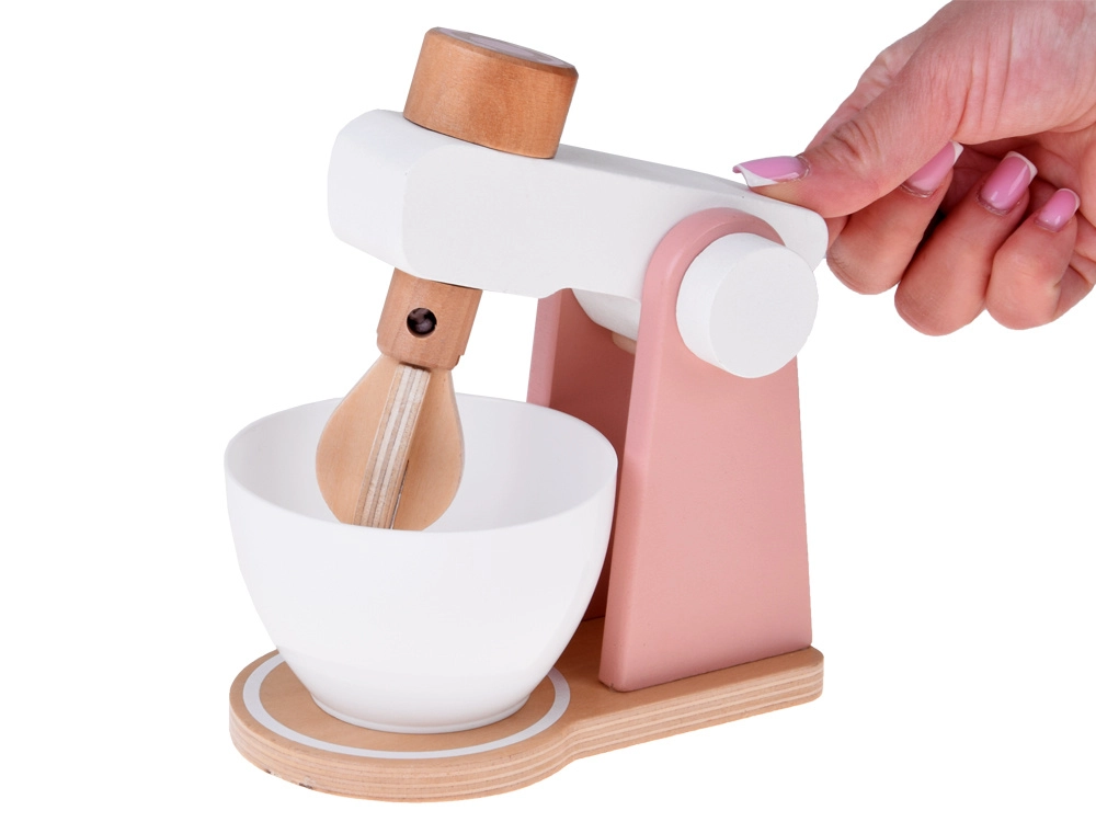 Stabile Holzkonstruktion, abnehmbare Schüssel und funktionsfähiger Drehknopf zur Simulation des Rührens von Teig oder Creme. Ideal für kleine Konditorinnen und Konditoren.