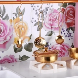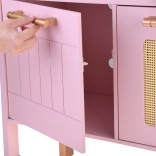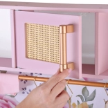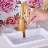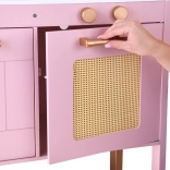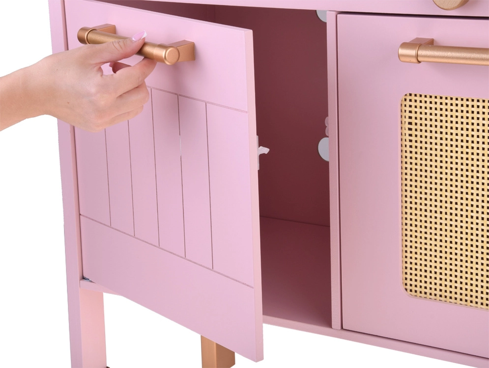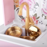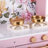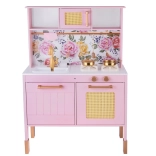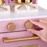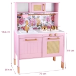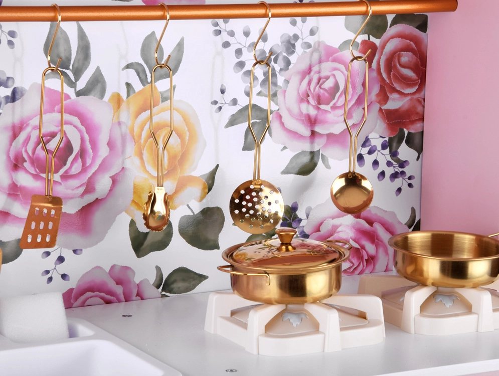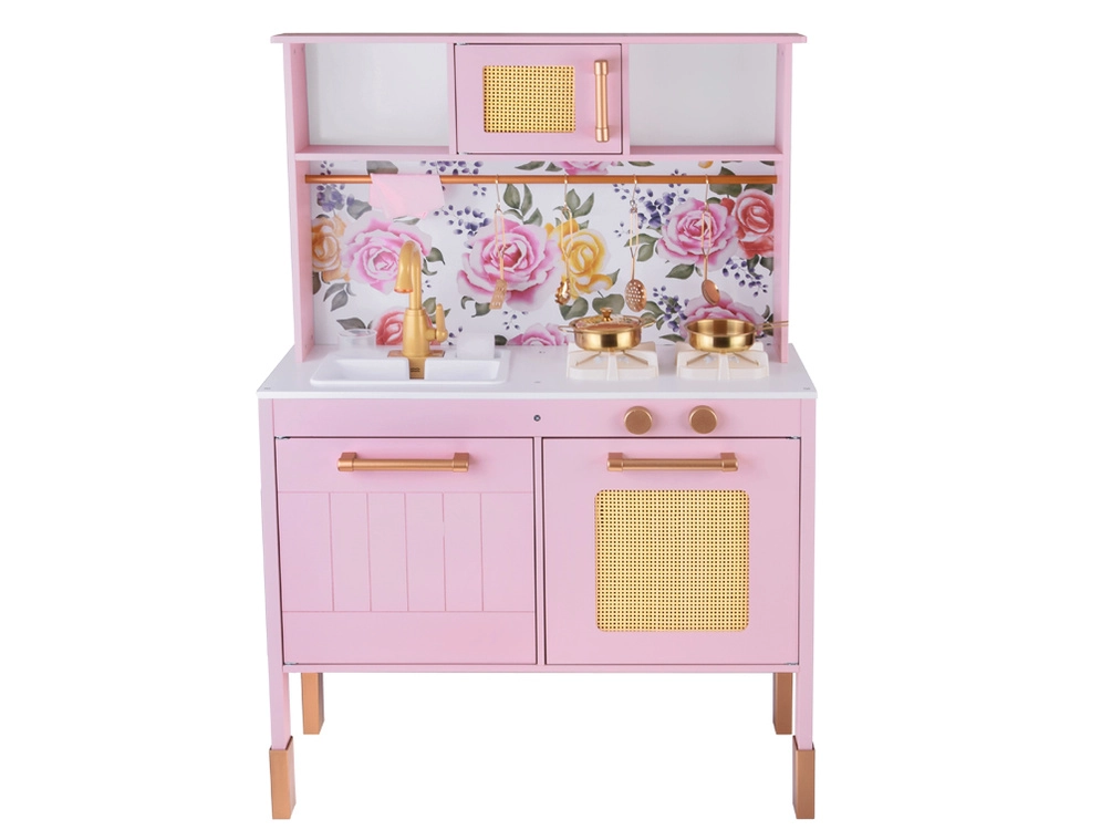 Diese Retro-Holzküche in zartem Rosa kombiniert robuste Materialien mit schönen Details: goldene Griffe, floraler Hintergrund und stabile Füße. Kinder haben Spaß am Nachahmen der Erwachsenen dank leuchtender Kochfelder mit Koch- und Brateffekt, drehbarer Knöpfe mit Klickgeräusch und Spülbecken mit goldener Armatur.